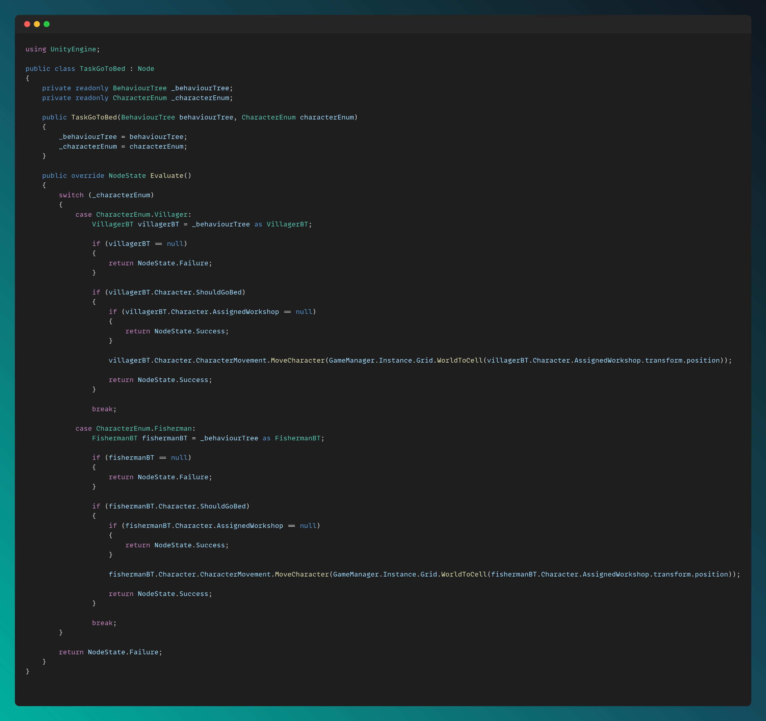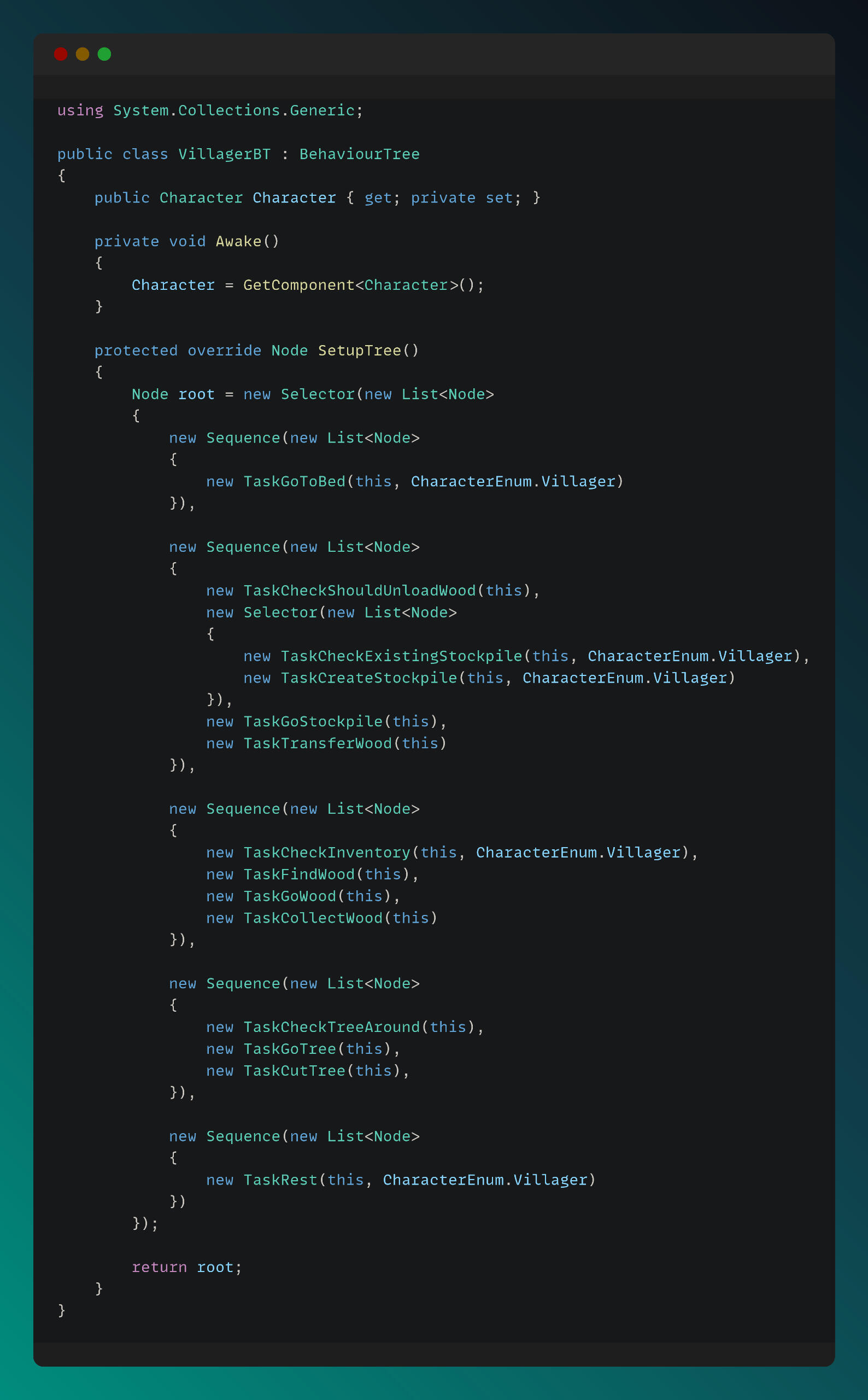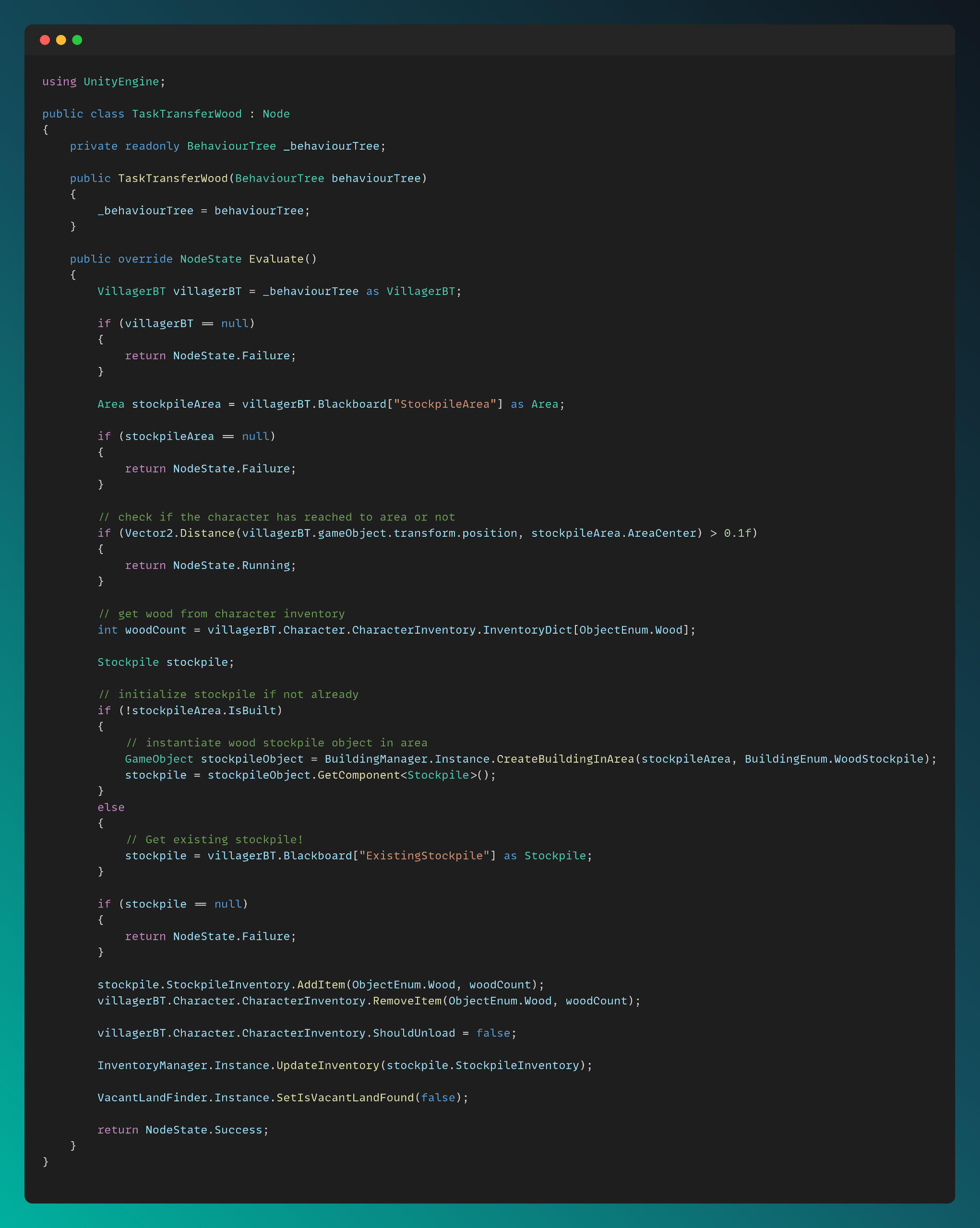 I am managing the flow of the tasks for each character type in the Evaluate method. Transfer Wood Task is executed by Villager BT only, so I only evaluate it for Villager Character.