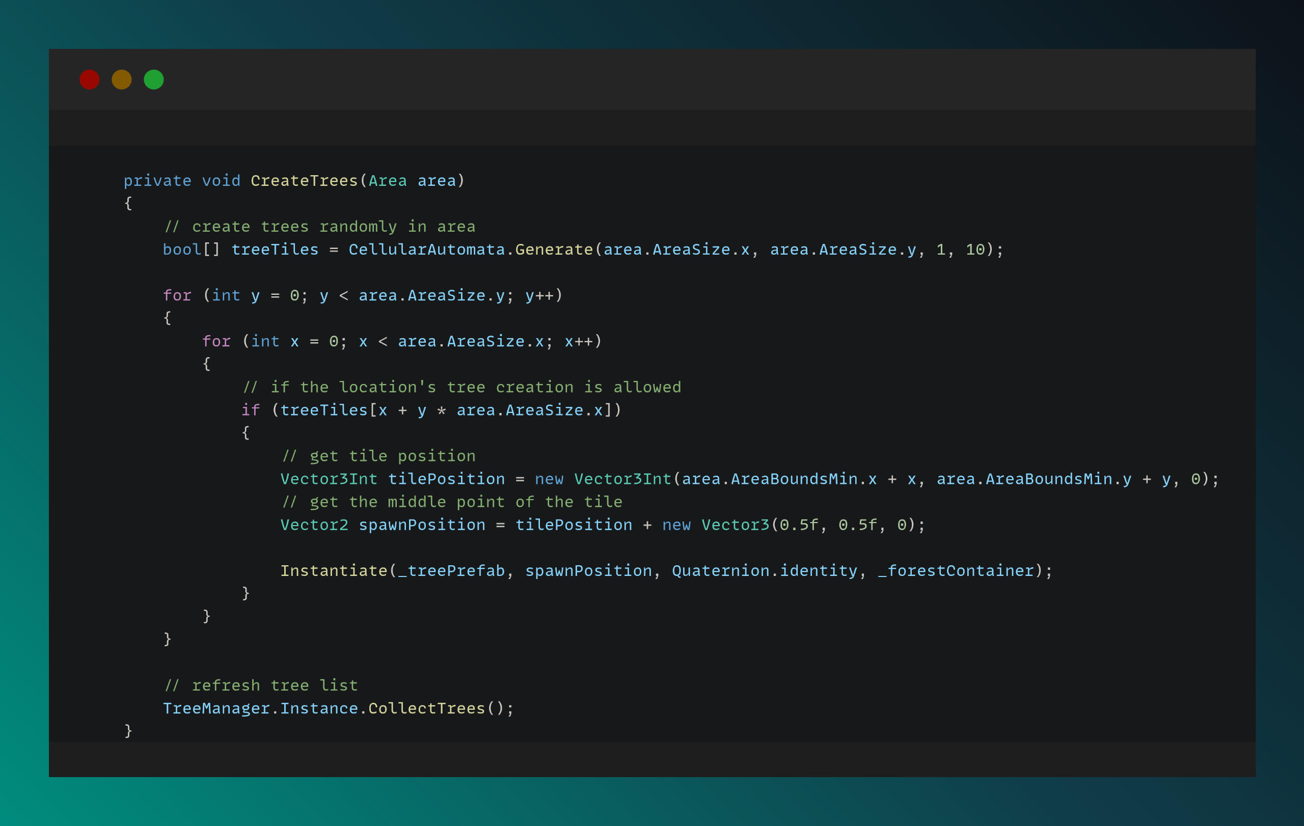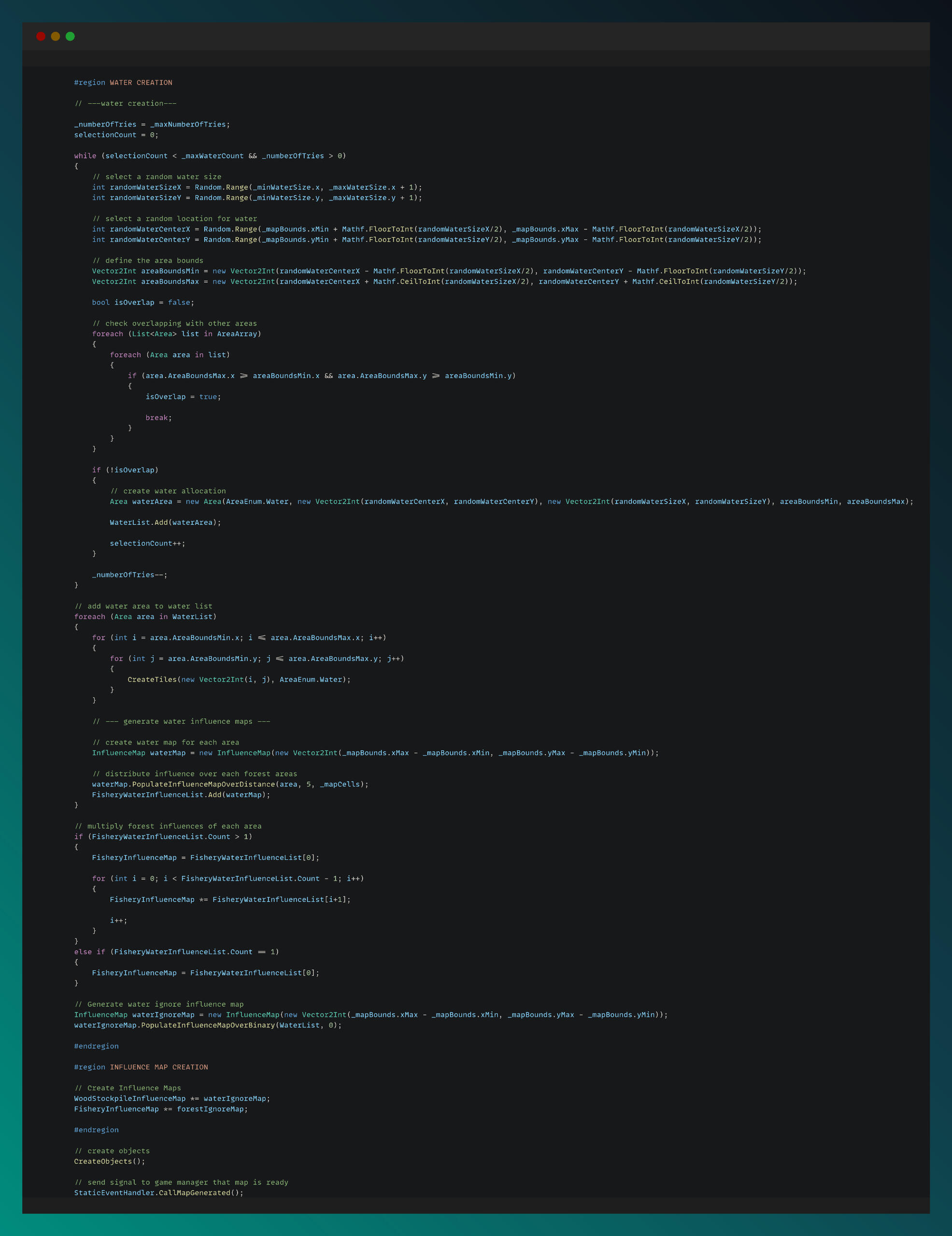 The codes are shown some parts of the procedural map generation logic with using Cellular Automata algorithm and Influence Map mapping.