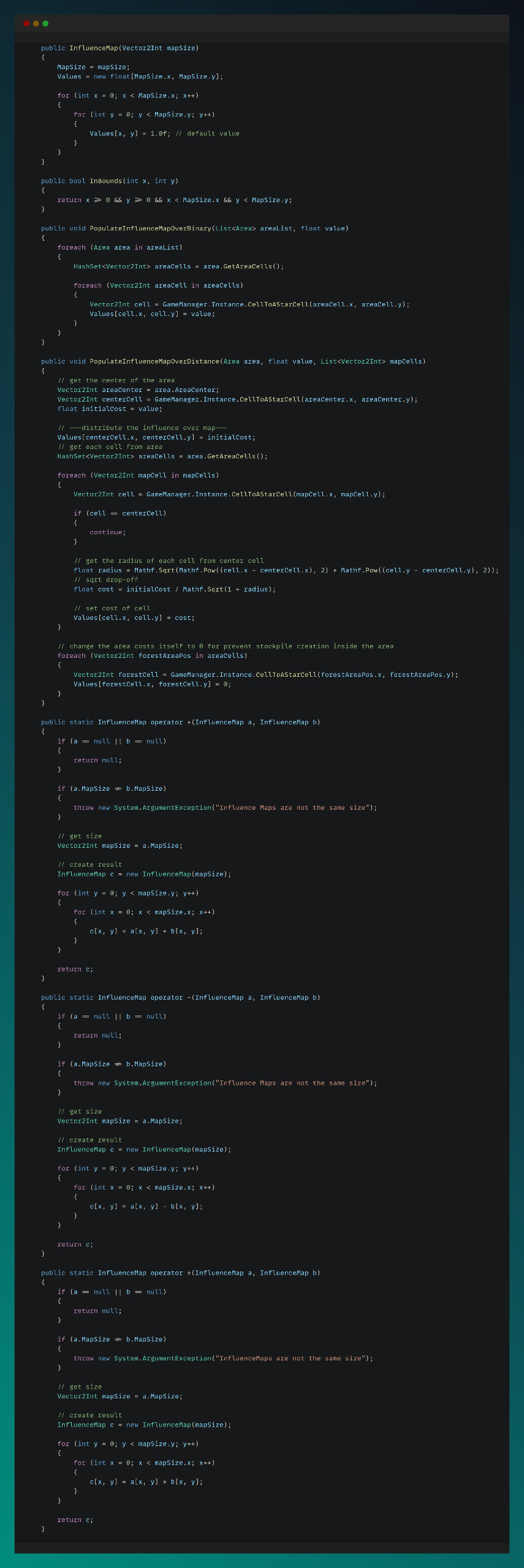 Solo ProjectGame Engine: UnityThis project is a fully automated, procedurally generated village simulation designed to showcase my expertise in grid system, generation algorithms, behavioral AI, pathfinding and inventory system. I’m continuously iterating on it to refine the systems and expand its complexity.I implemented an A* algorithm for the pathfinding system and built a customizable behavior tree framework with specialized tasks for each type of villager. To determine optimal locations for stockpiles, workshops, and buildings, I developed an influence map system tailored to the simulation’s needs. My goal was to create a strong and expandable foundation that supports increasing complexity and emergent simulation showcase.