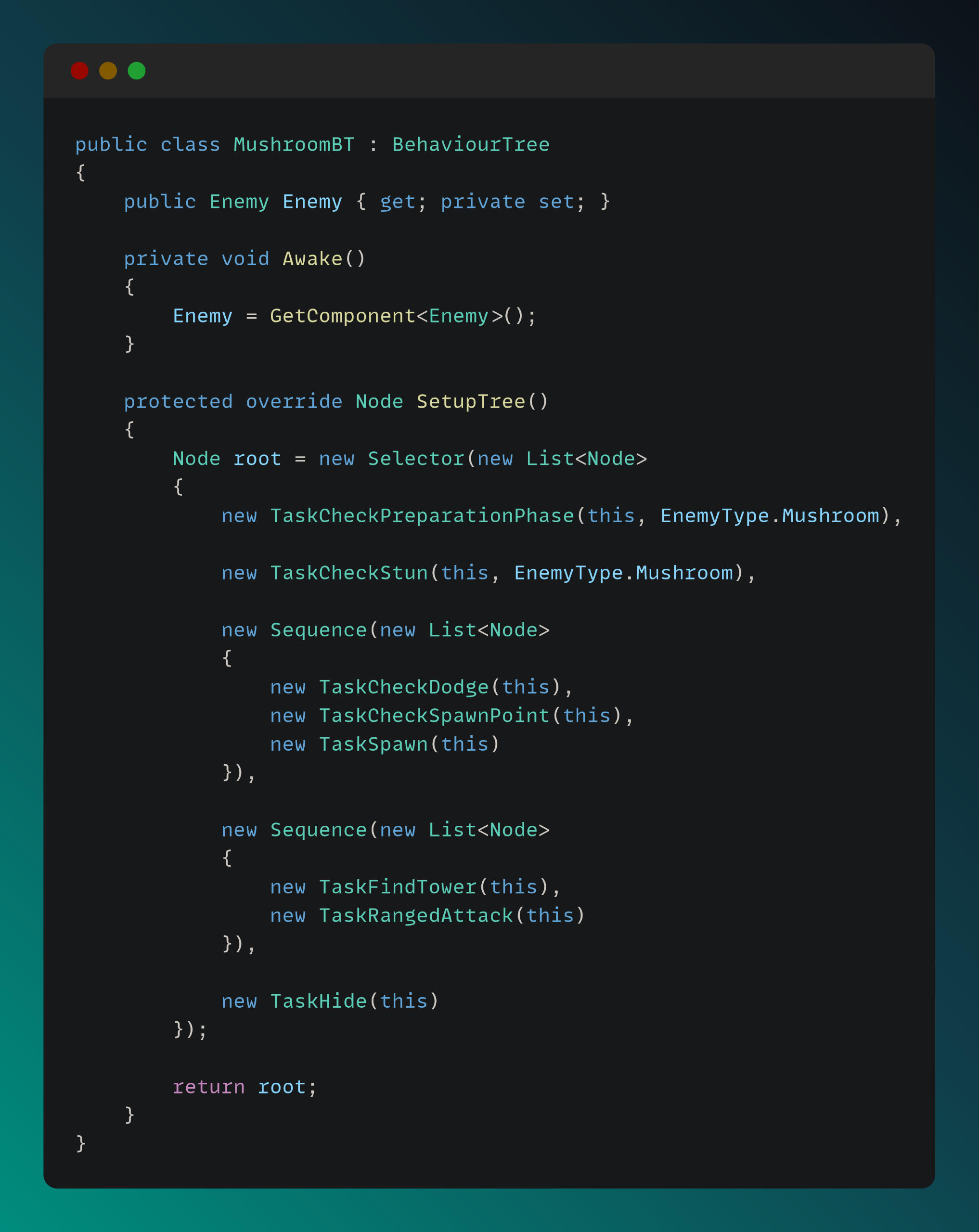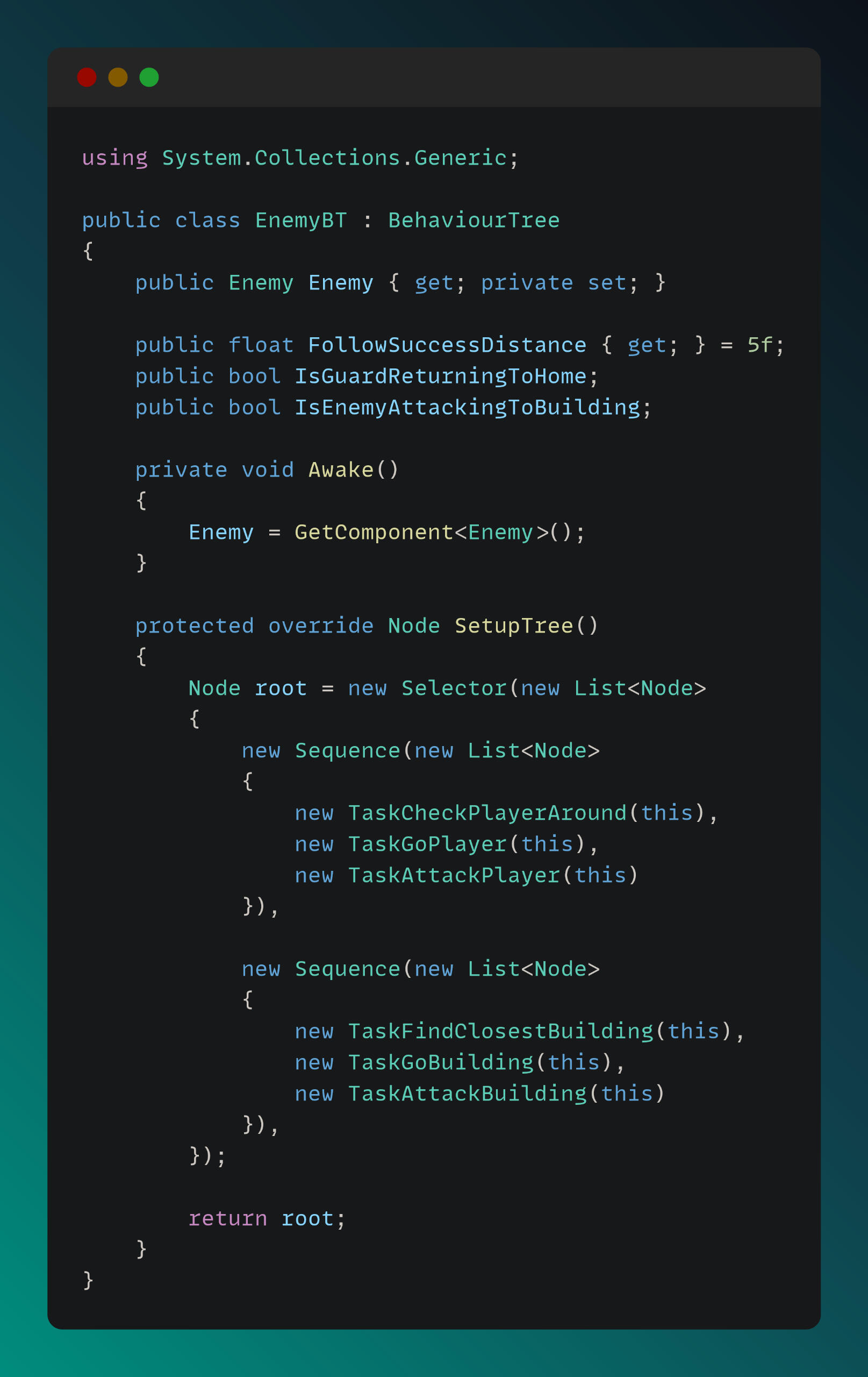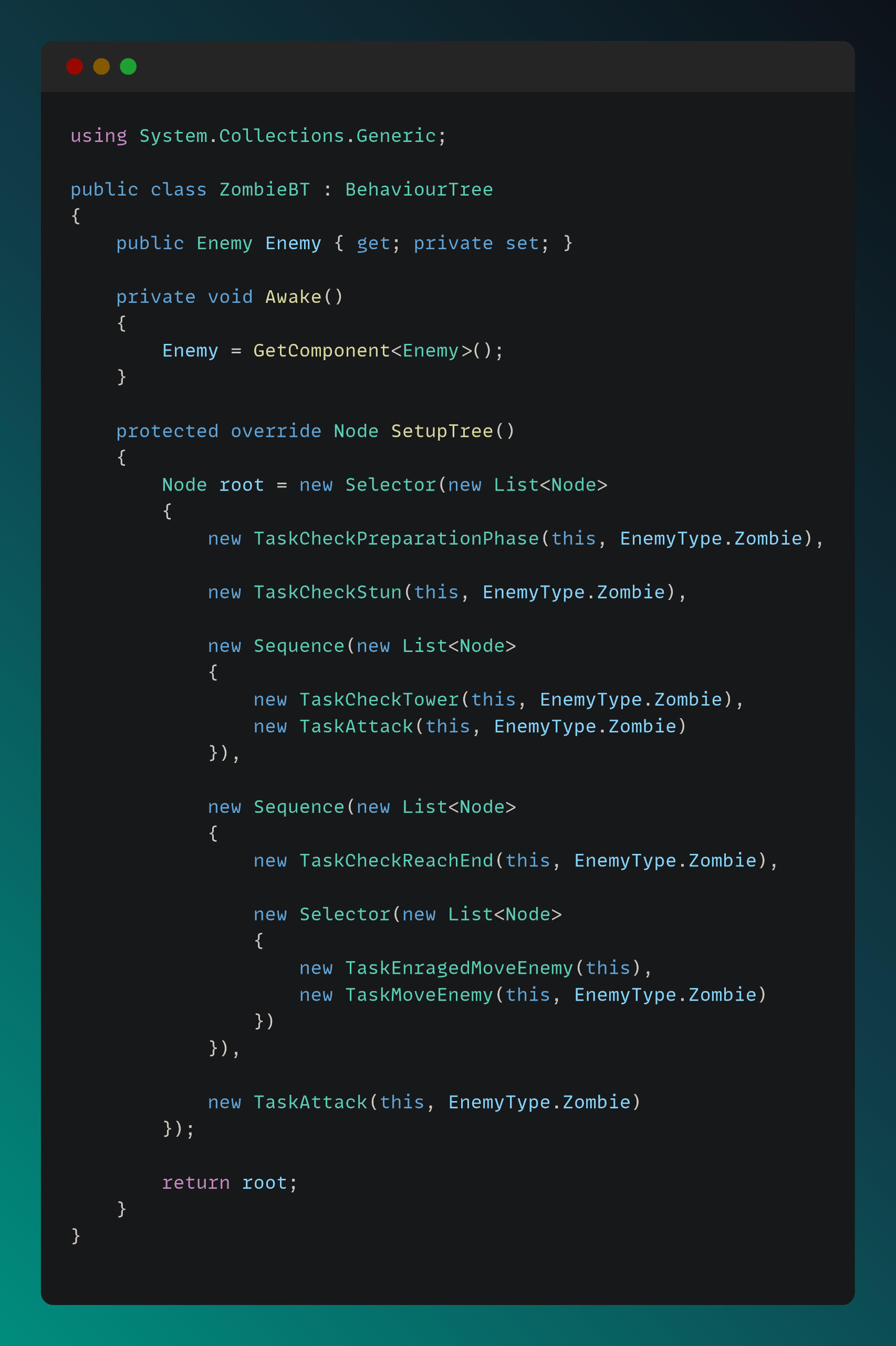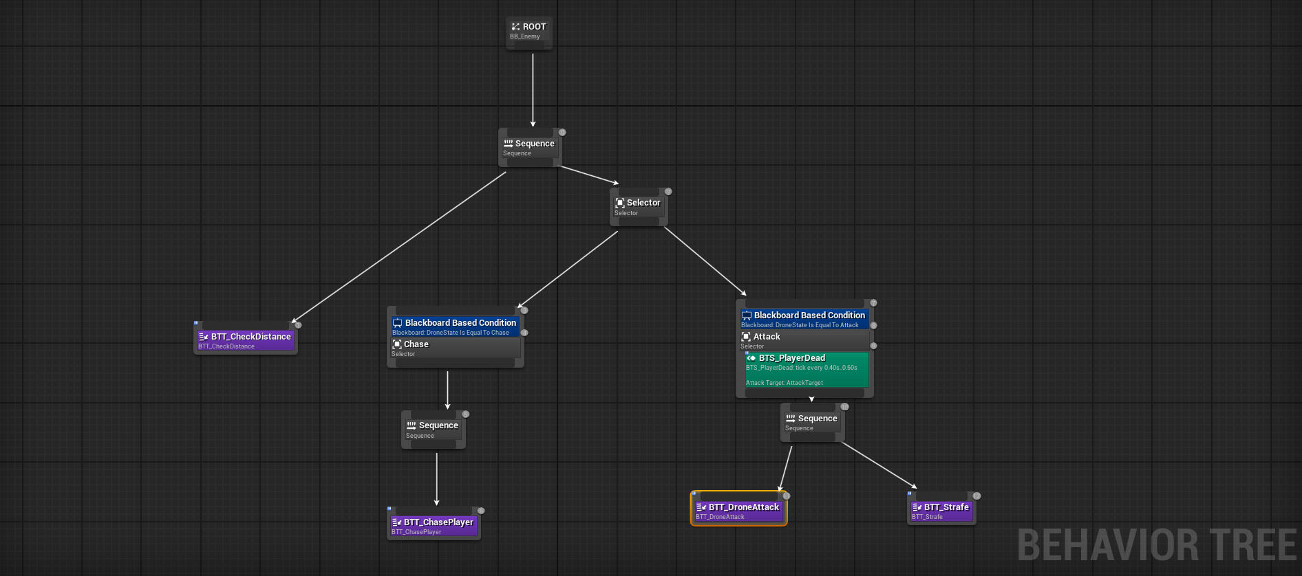 Enemy AI logic is driven by a Behavior Tree system. I designed and implemented the Behavior Tree and its tasks to meet the gameplay requirements. The EnemyBT script is shown below.