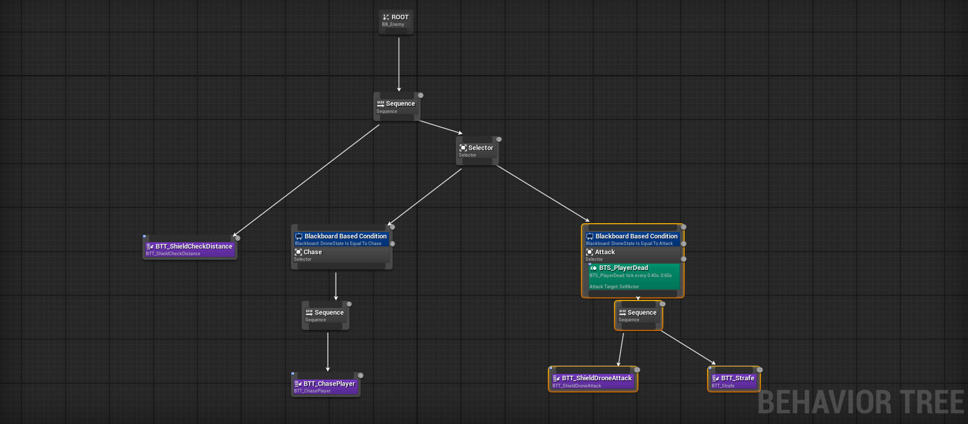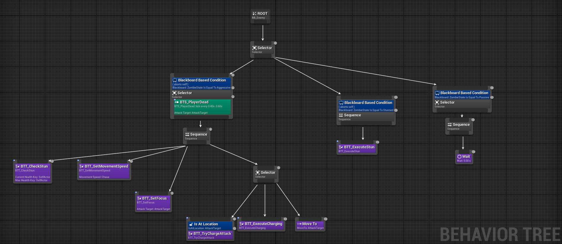 We have separate behavior trees for each enemy type. Some tasks are shared among several enemies, and complex AI tasks are heavily coupled with C++ to achieve an optimized codebase and enhanced performance. As an example three behavior trees are shared below: