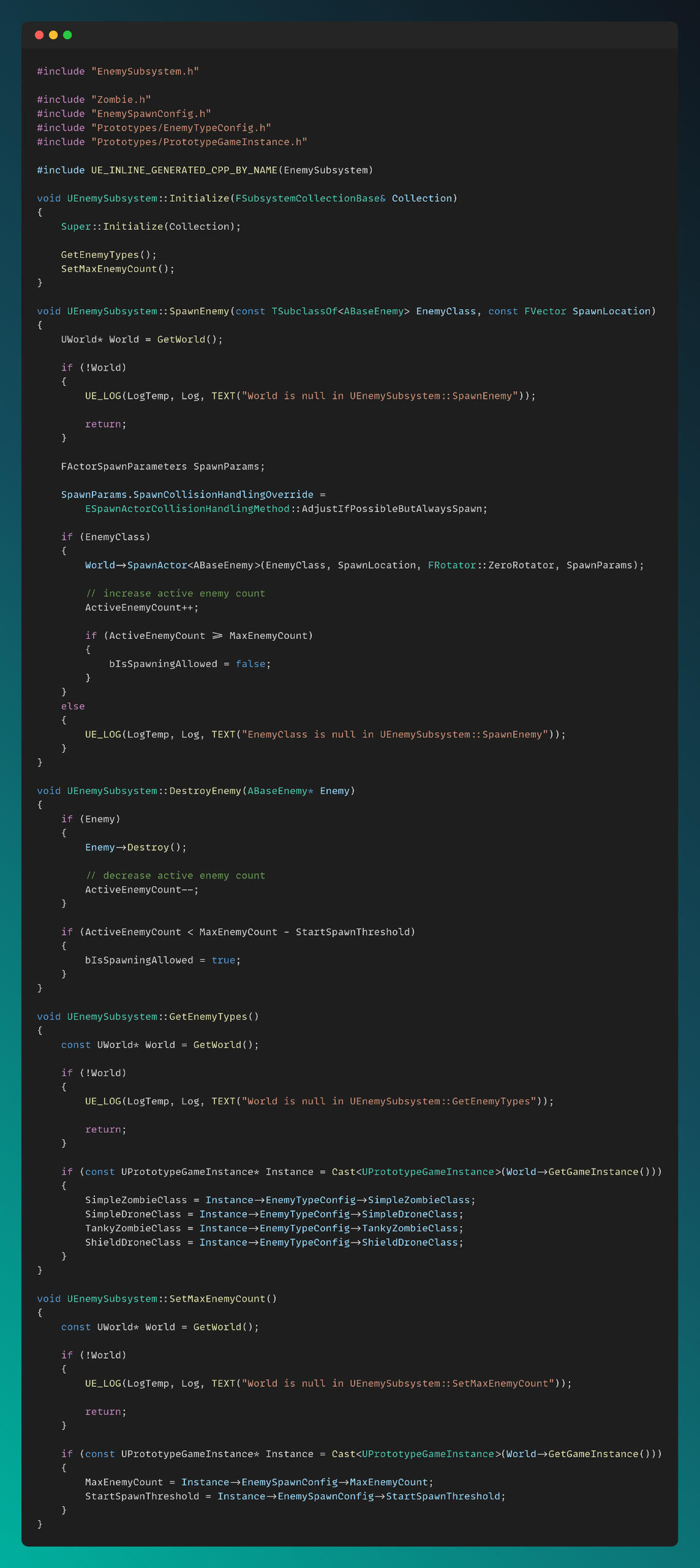 I created a world subsystem for enemy to get enemy related references from game instance and manage the whole enemy spawning and destroying system.