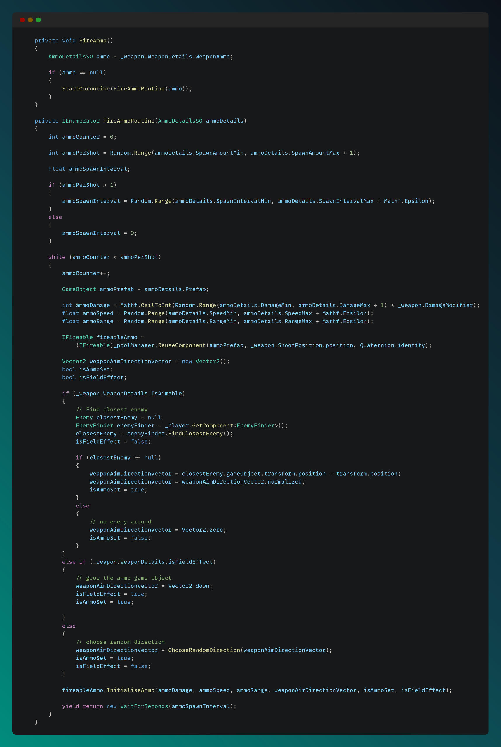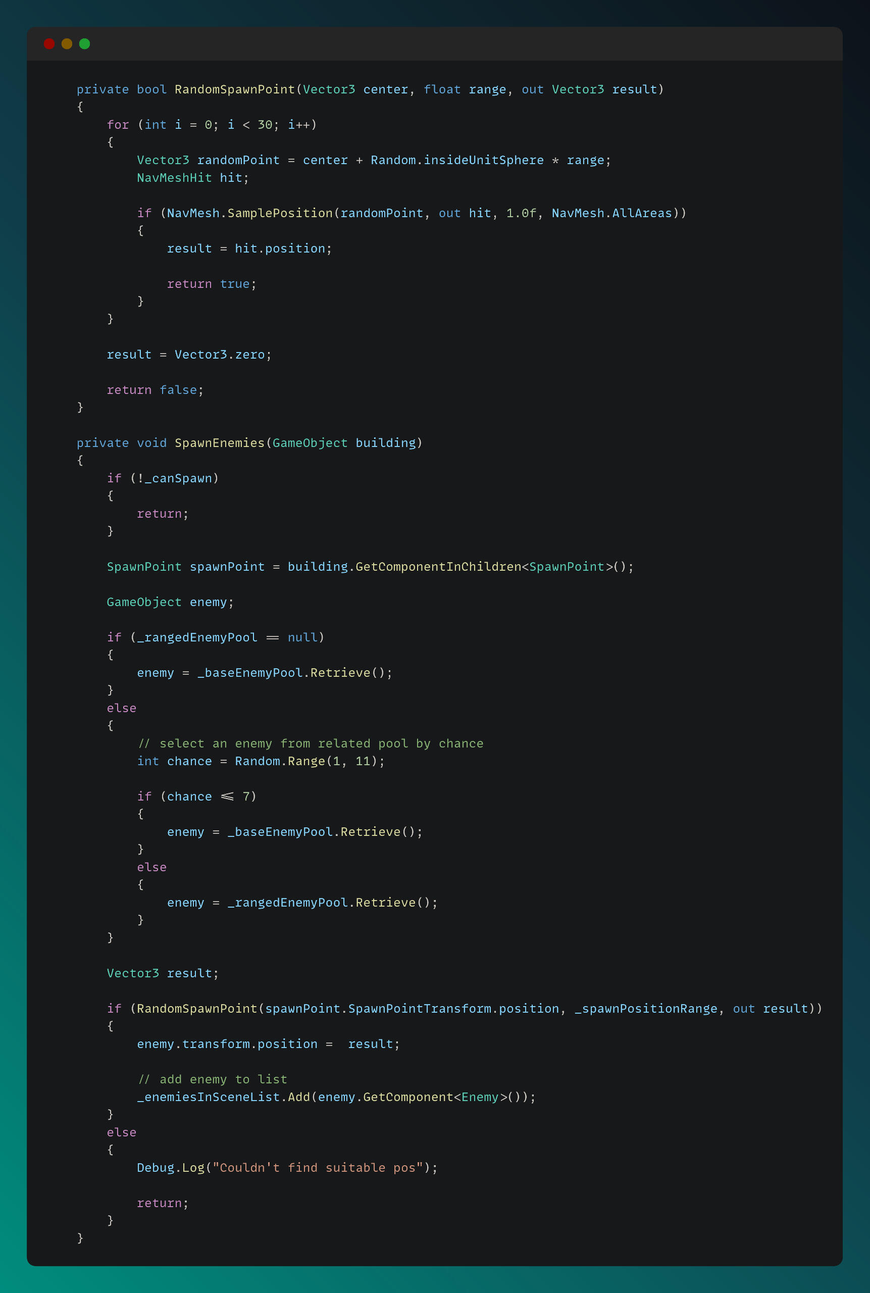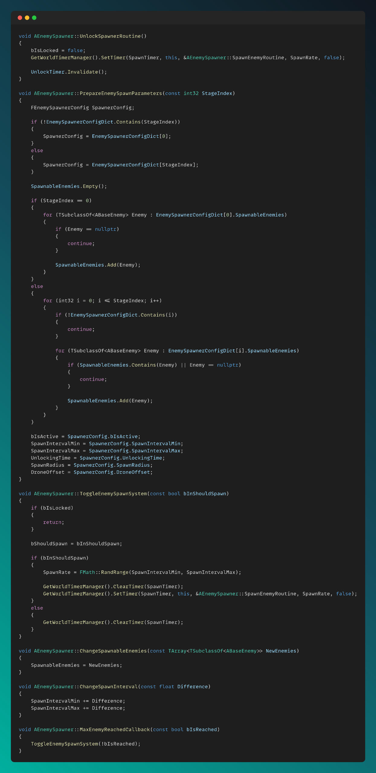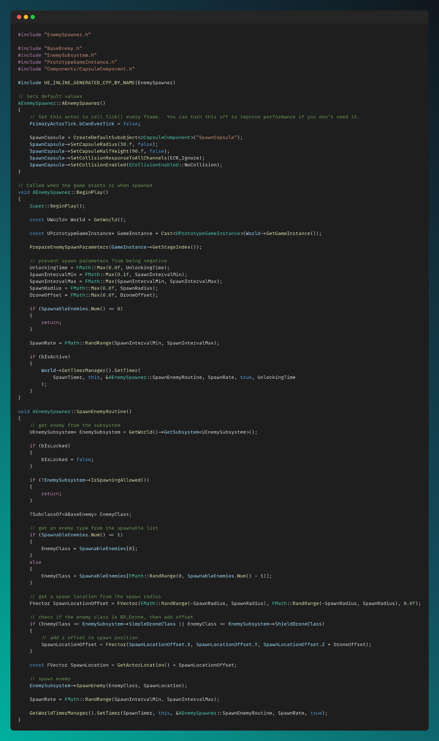 I implemented an Enemy Manager to handle enemy related events and spawning. The spawn logic is demonstrated in the snippet below.