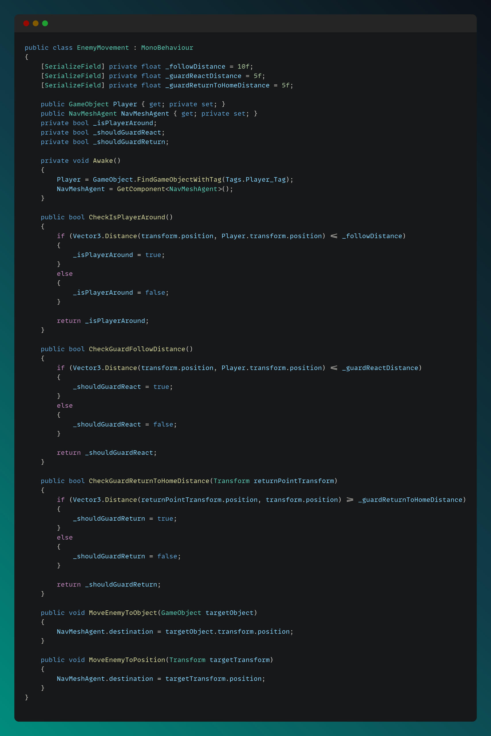 The Enemy Movement script, shown below, includes the methods passed to the Behavior Tree to handle AI movement and reactions.