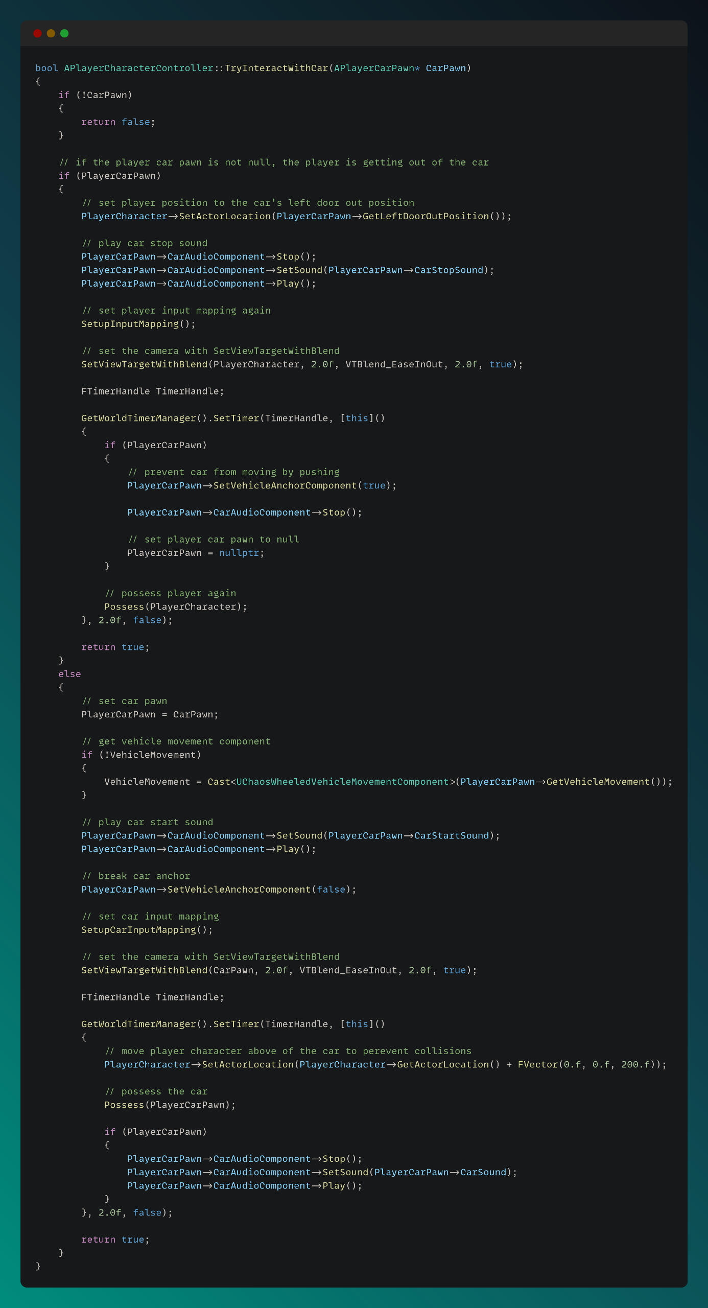 One of the biggest challenges in the project was ensuring a smooth controller transition from the player pawn to the truck pawn. The function below demonstrates this transition: