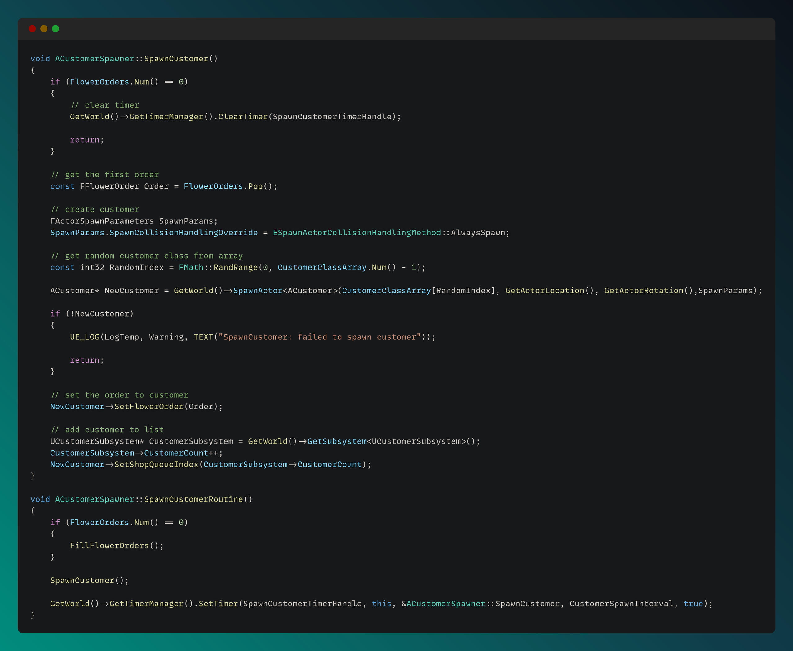 For spawning customers, I created a dedicated customer spawner actor and implemented the spawning functionality within its class. The SpawnCustomer and SpawnCustomerRoutine functions can be seen in the code below: