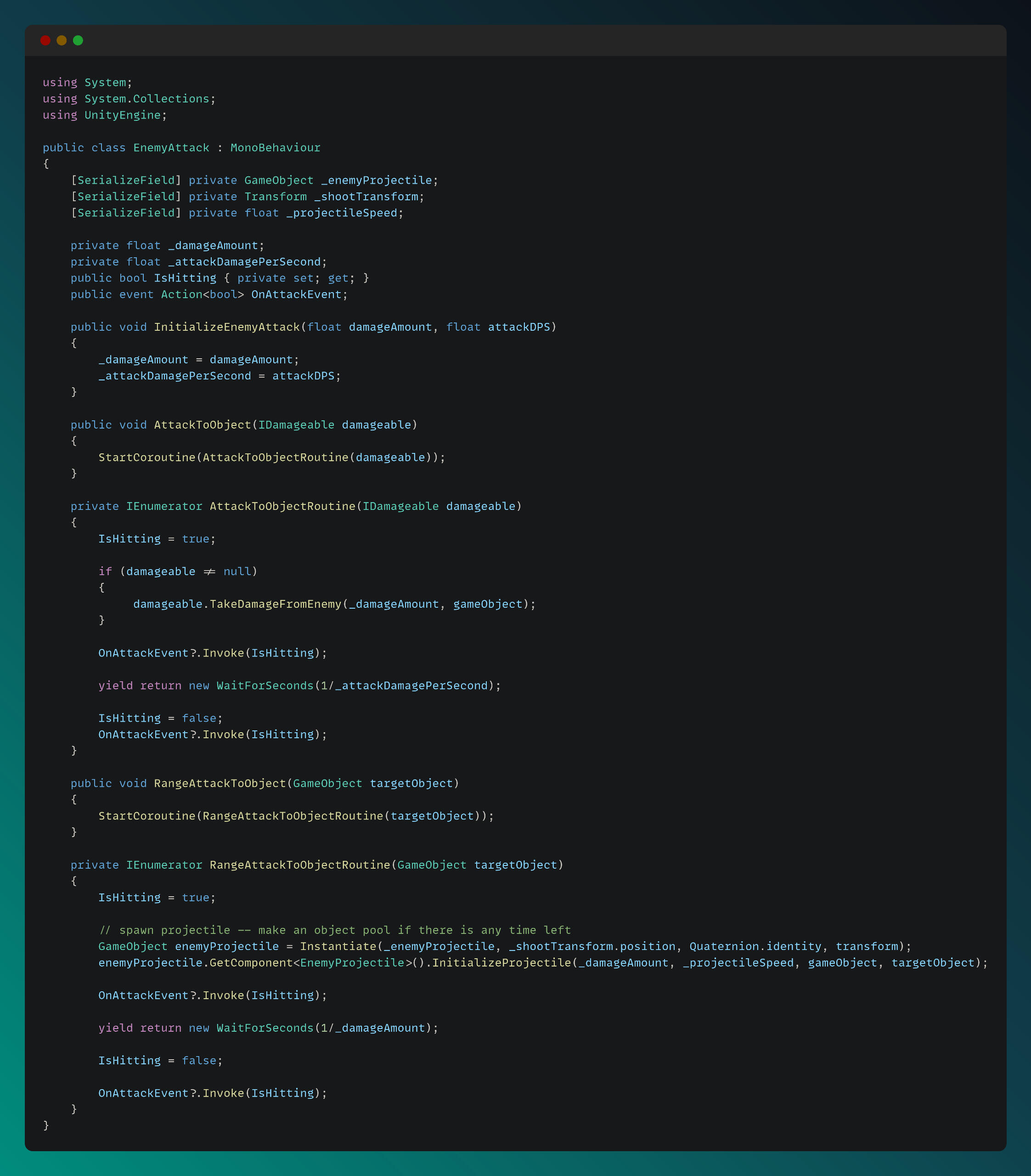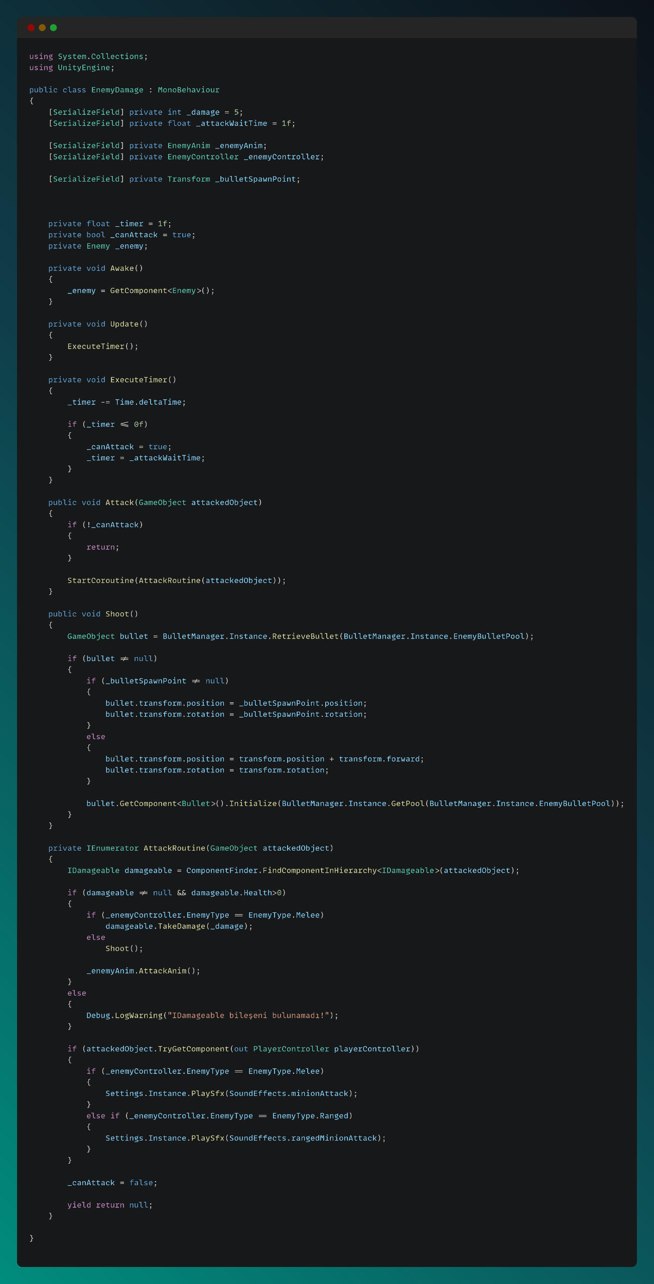 Below is the Enemy Attack script, which handles both melee and ranged attacks: