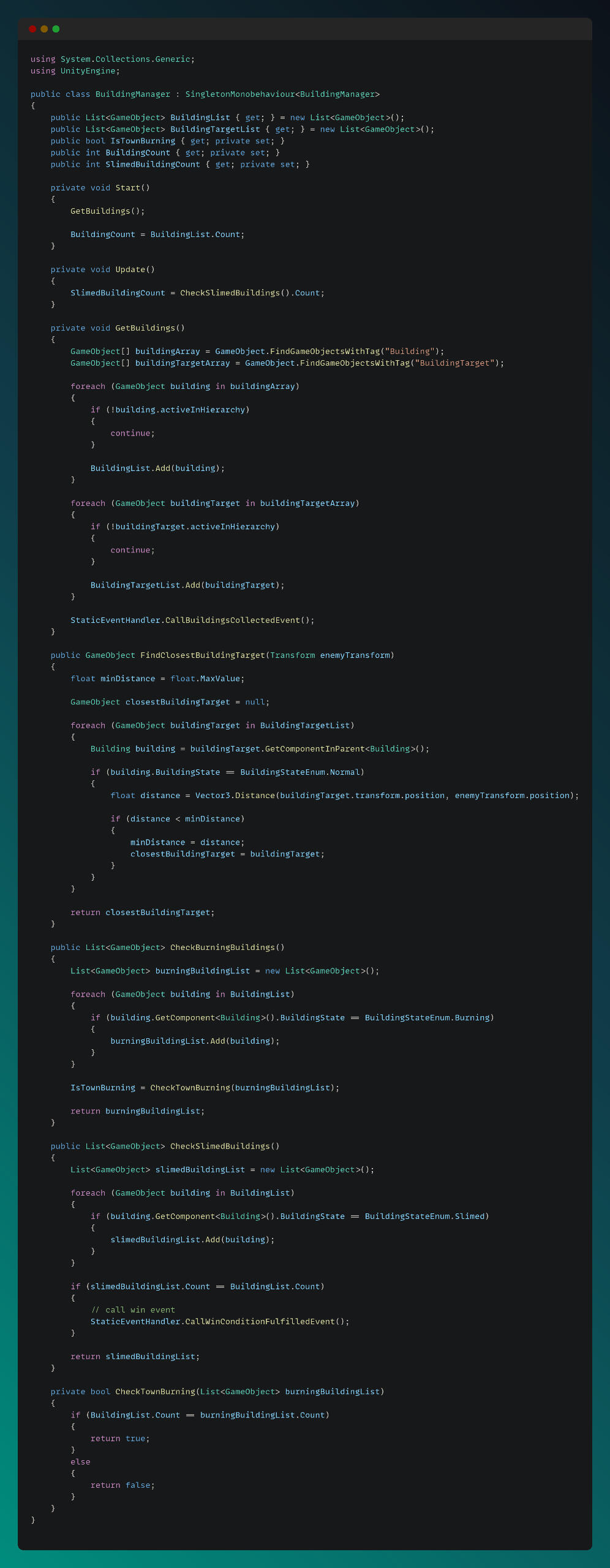I developed a Building Manager that tracks the slimed and burning states of buildings. It communicates with a custom-built Event System I designed, which publishes the win condition event when all criteria are met.