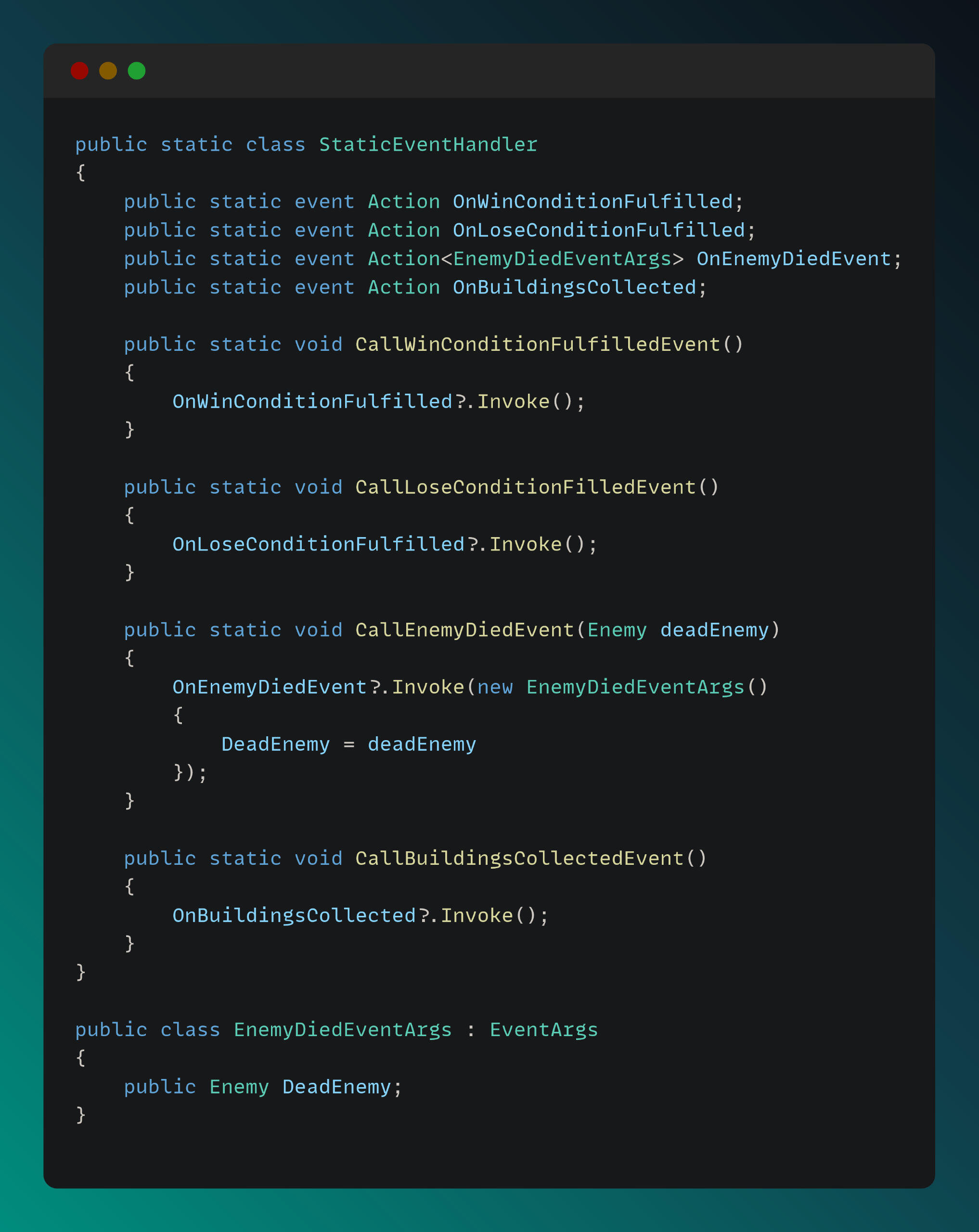 A static event handler was implemented to support the publish–subscribe pattern, ensuring a clean and SOLID architecture.