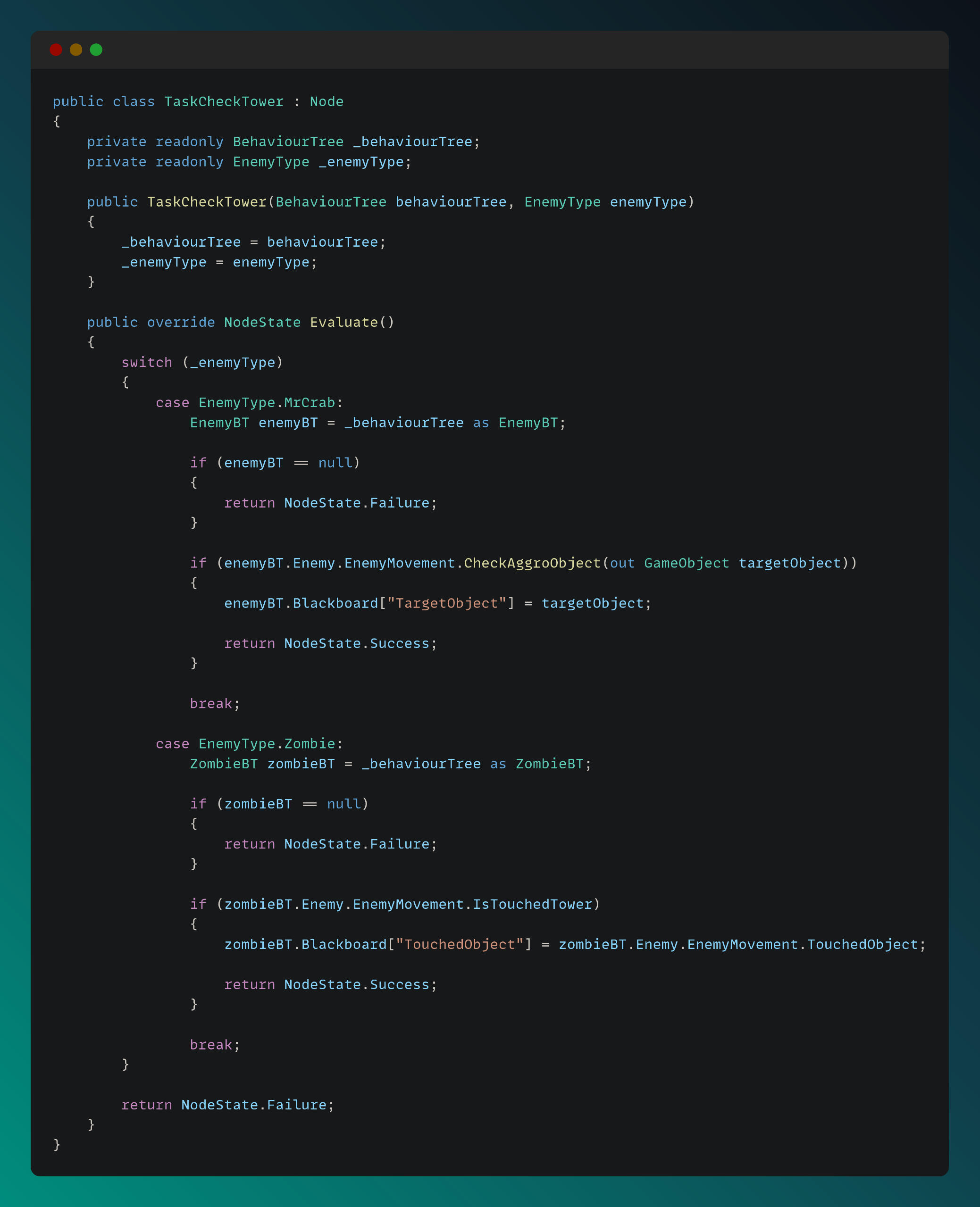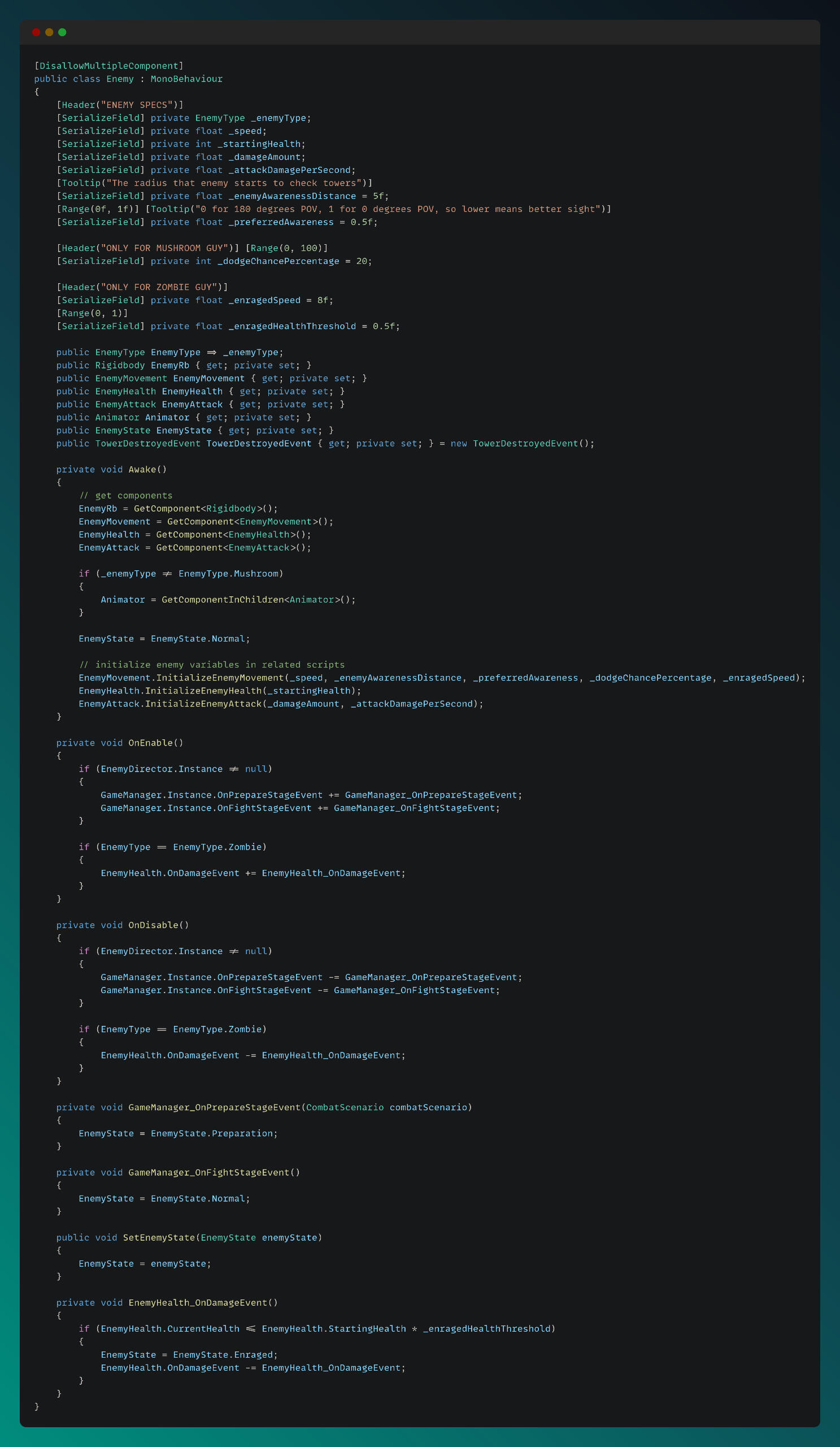 I separated each enemy’s core systems into different scripts and used the main Enemy script as an interface for them. The main Enemy script is shown below: