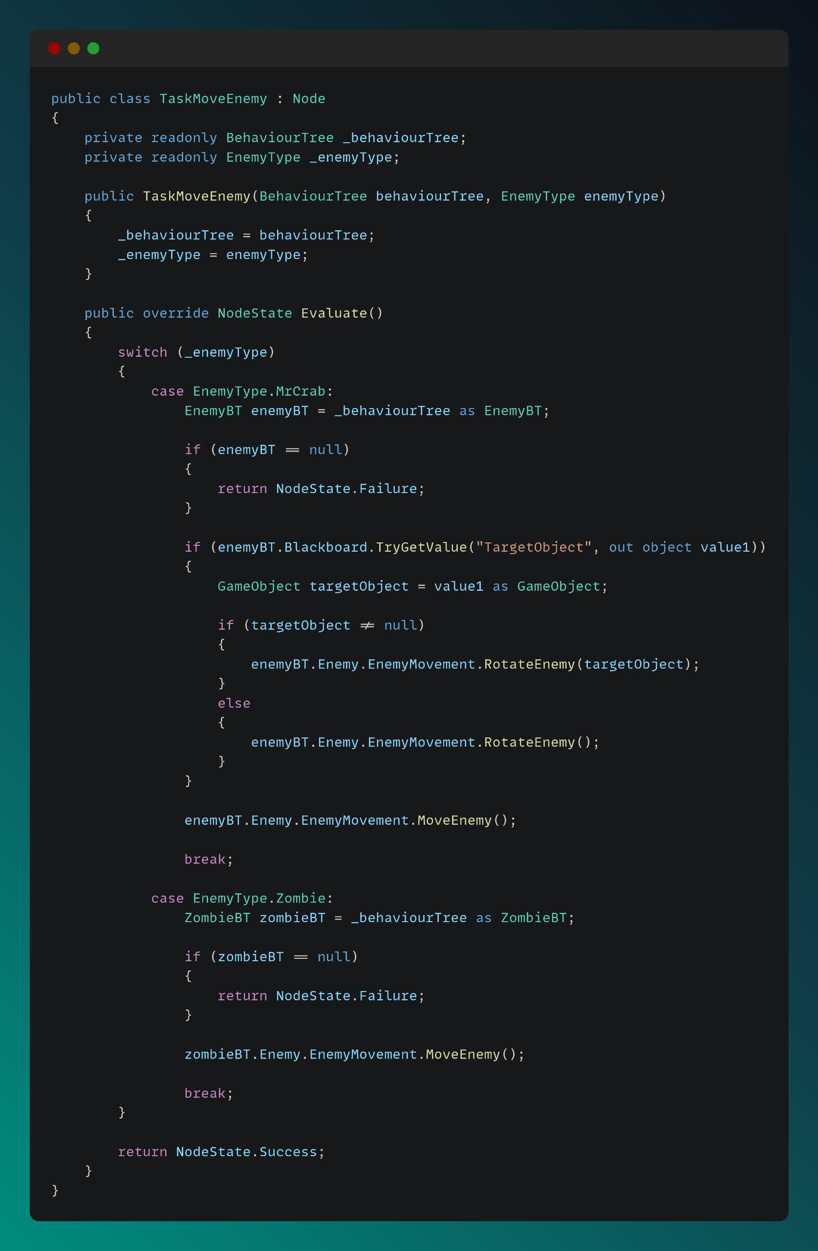 I developed the unique AI behaviors for enemy types in this game. Each enemy has its own tasks, with distinct behavior, movement, and attack features.You can see each enemy's behaviour tree scripts below.