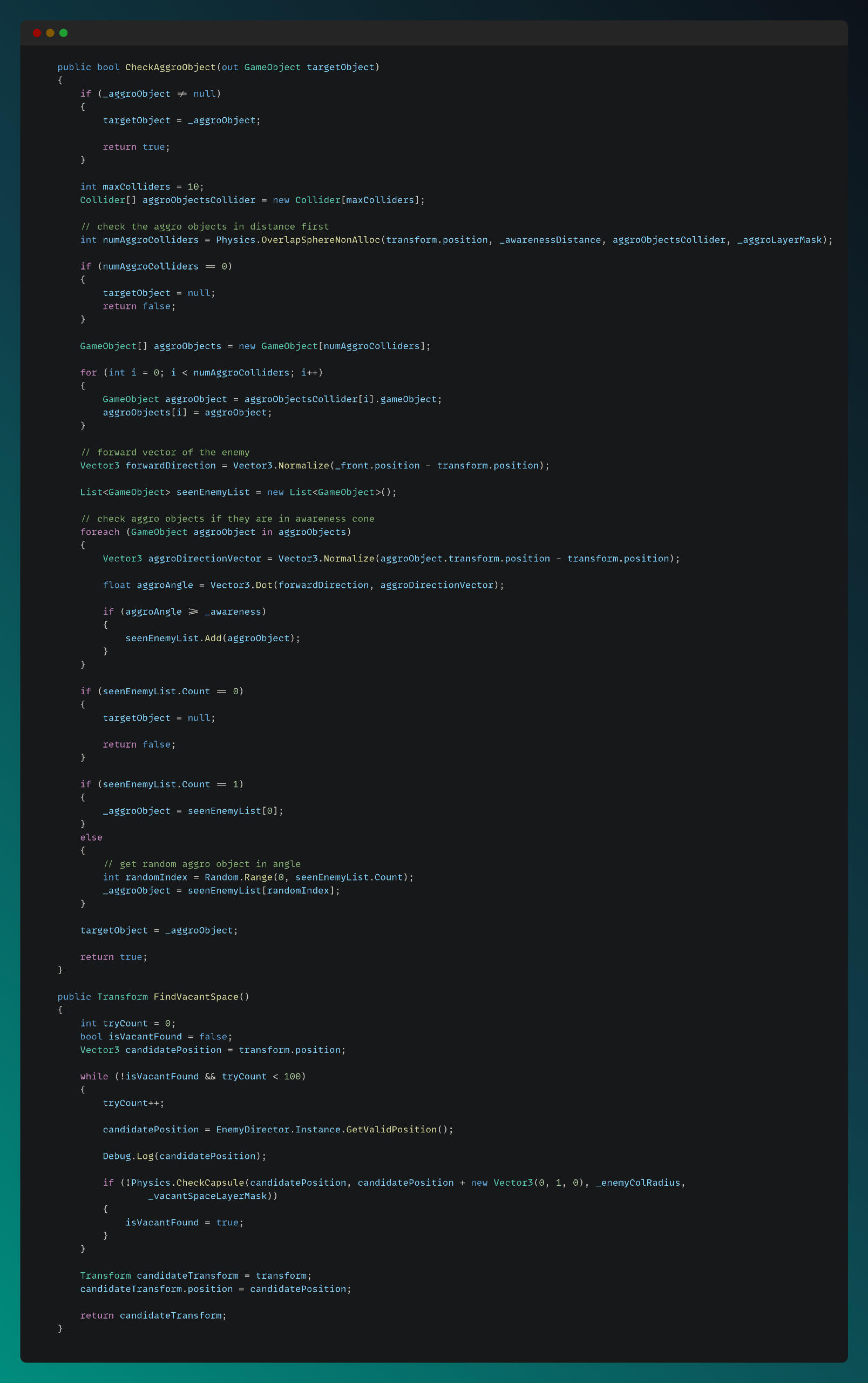 The enemy movement script handles functionalities that can be used across different tasks. I implemented a unique sight cone for enemies using dot product calculations. Two methods, finding the aggro object and finding vacant space, are shown below: