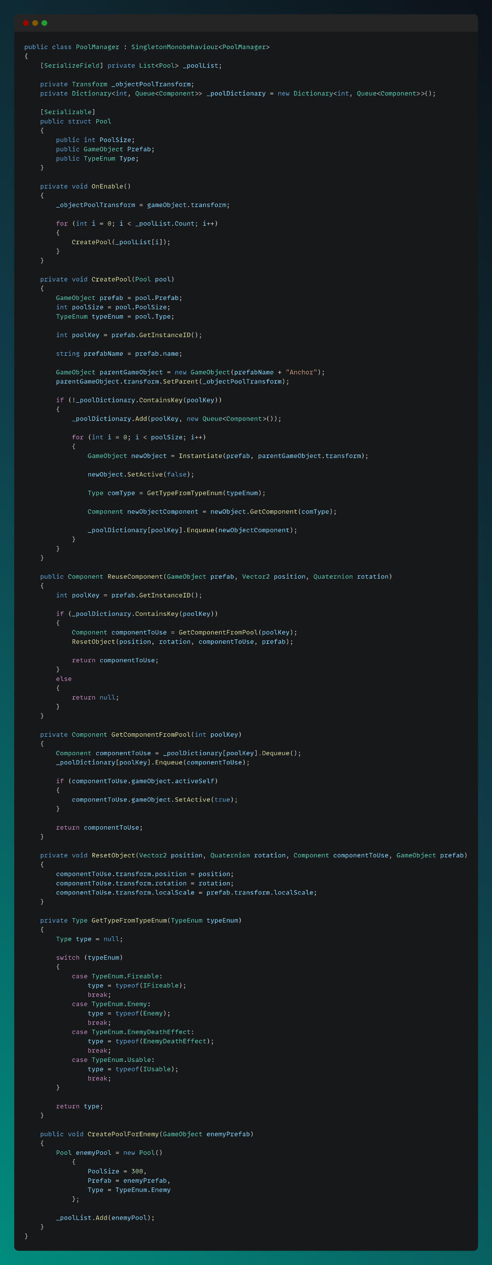 I implemented an object pool manager to handle multiple object pools within a single script, since the game is very spawn-heavy. By using object pooling, we minimized the performance cost of frequent instantiation and destruction, reducing both CPU overhead and memory allocations. This optimization ensured smoother gameplay and more efficient resource management.