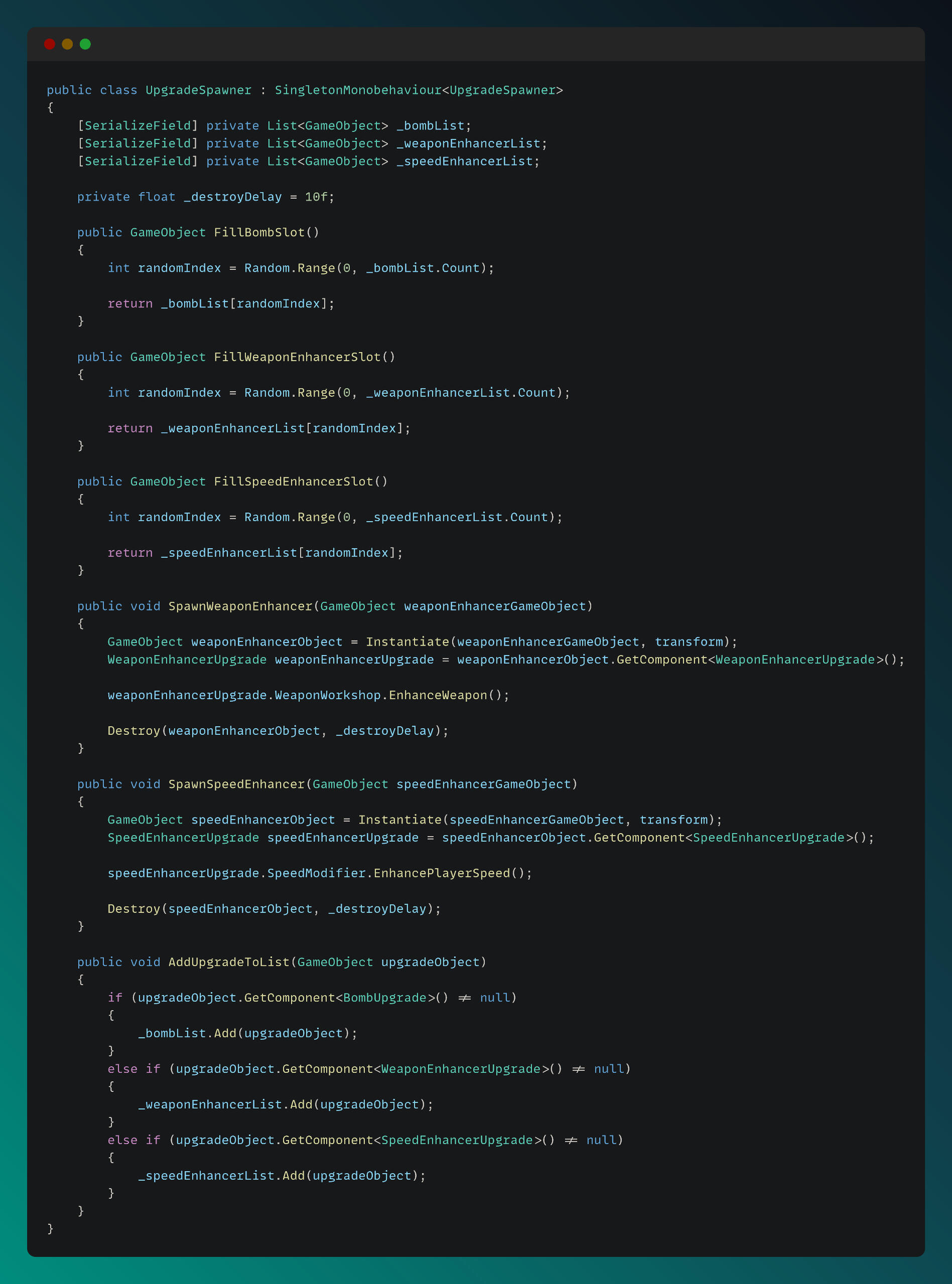 For the upgrade system, I created Upgrade class which is inherited from MonoBehavior and used as a parent class for different upgrade types. UpgradeSpawner class can be seen below: