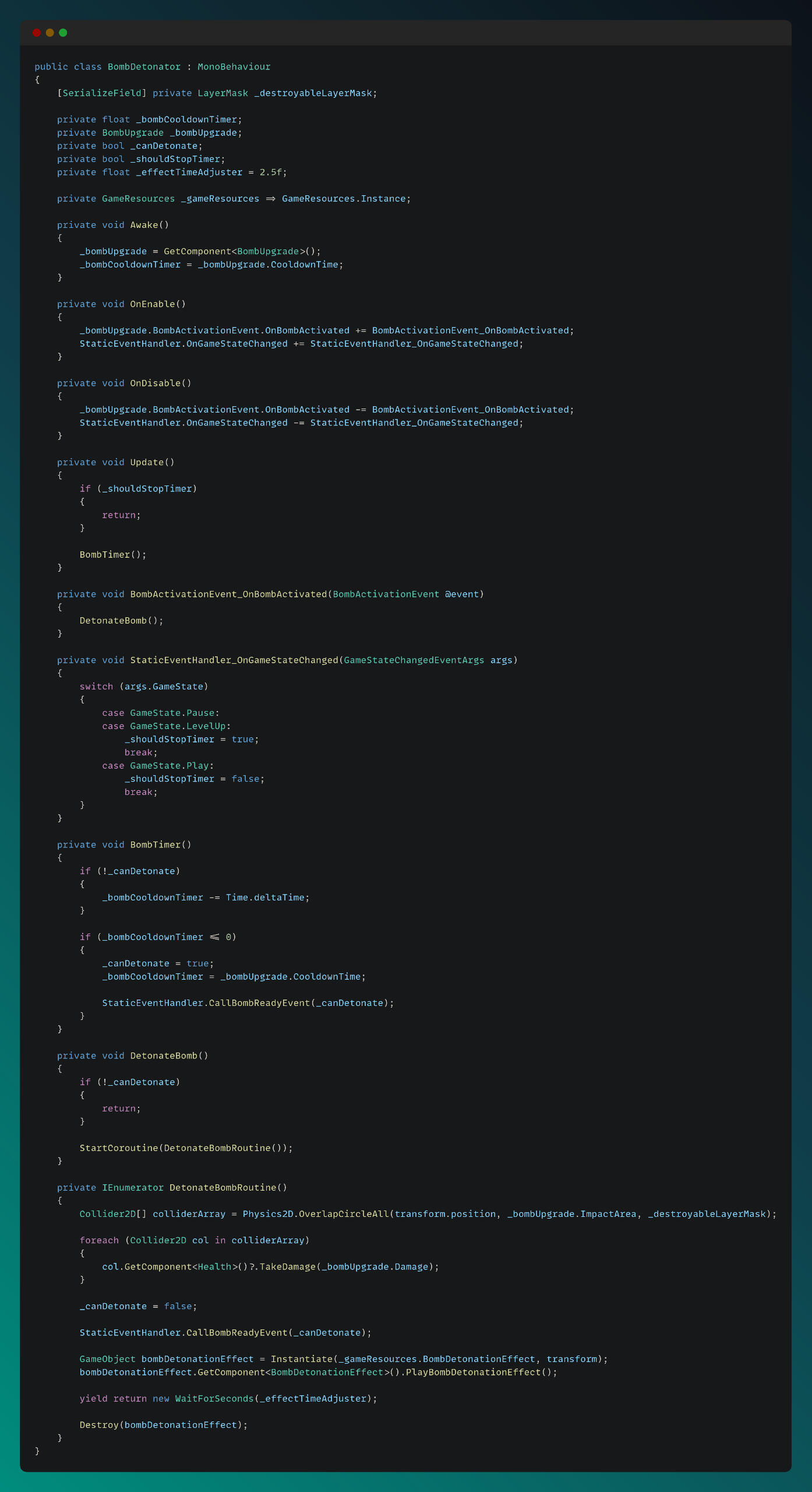For the bomb upgrade, I created BombDetonator class to handle bomb detonation logic, which can be seen below: