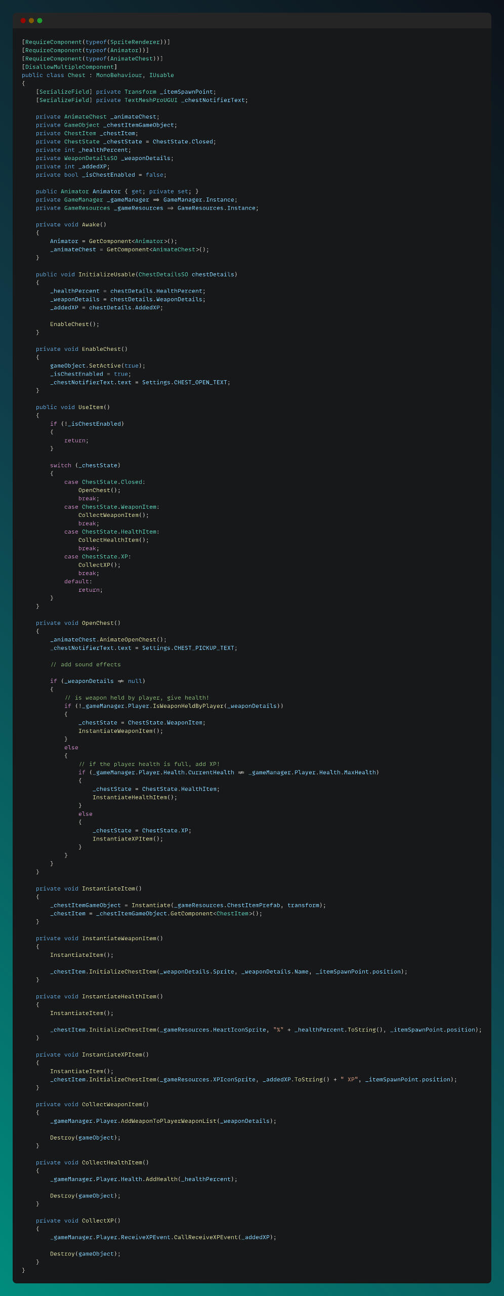 For chests, I implemented a chest class which is inherited from MonoBehavior and uses IUsable interface, which can be seen below: