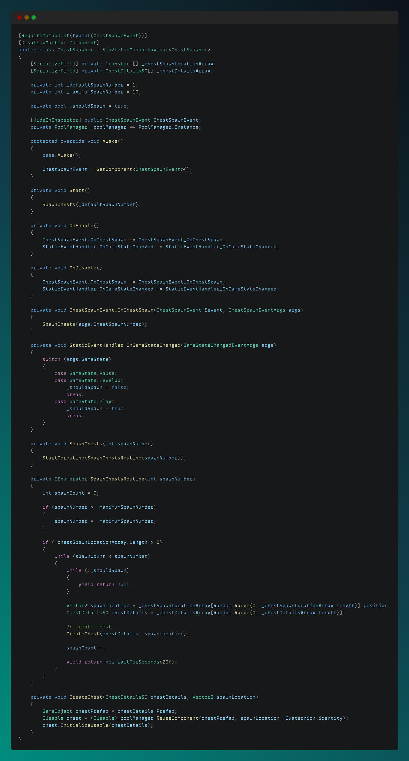 Chest Spawner script handles chest spawning logic, with using object pool and coroutines: