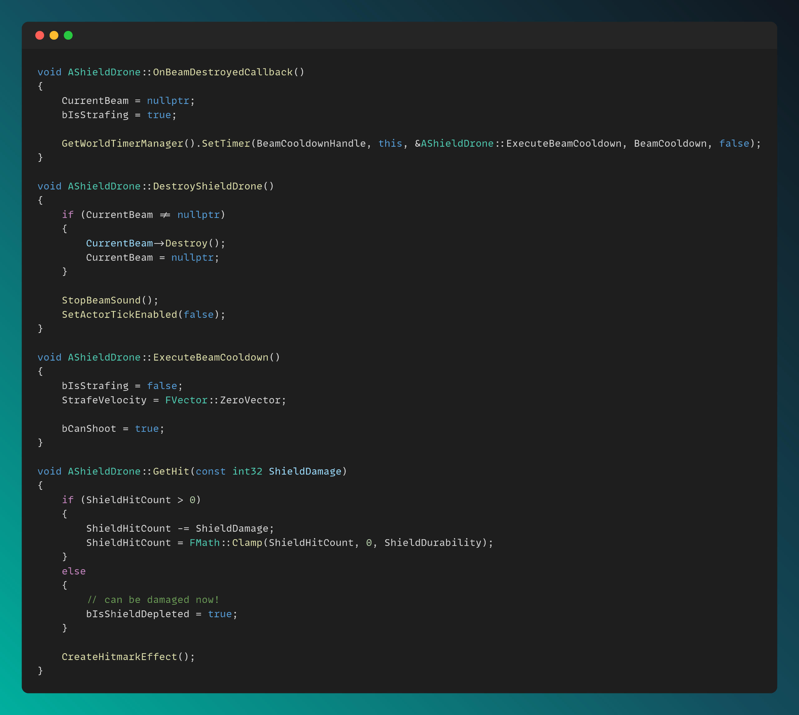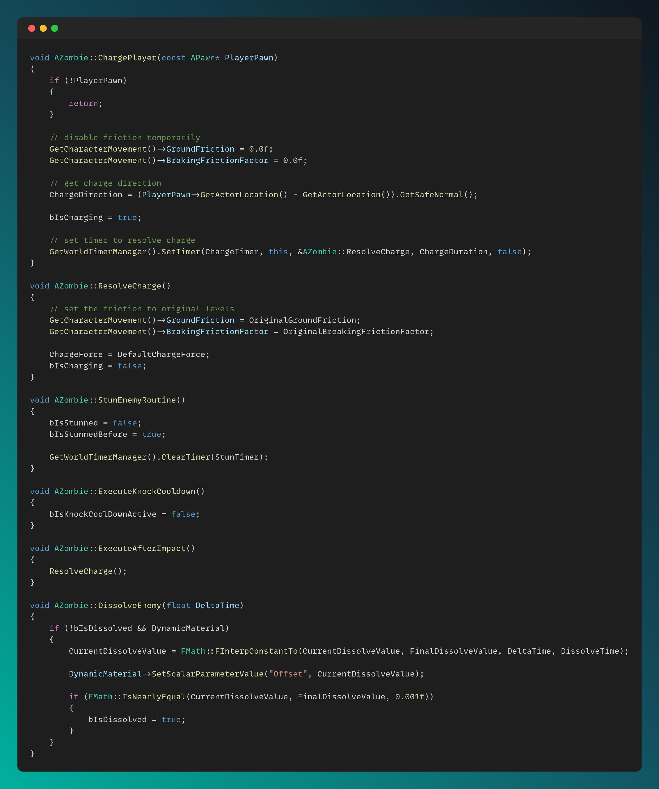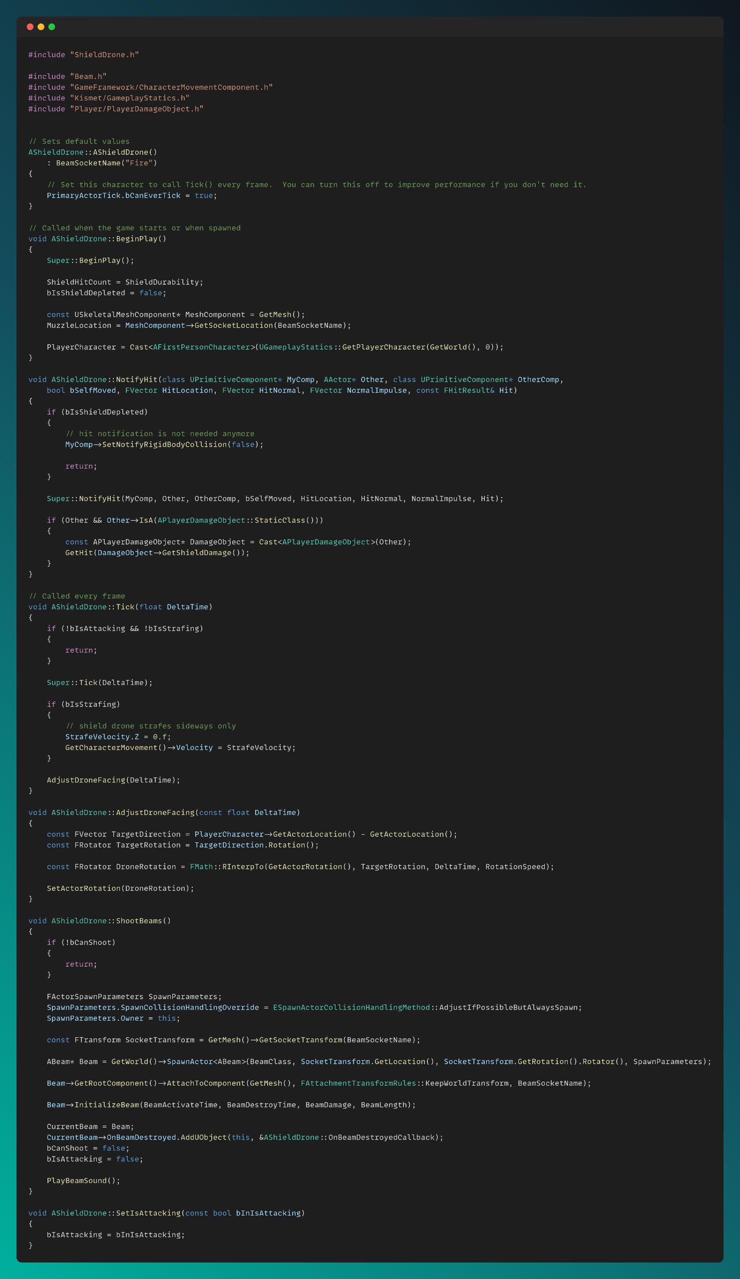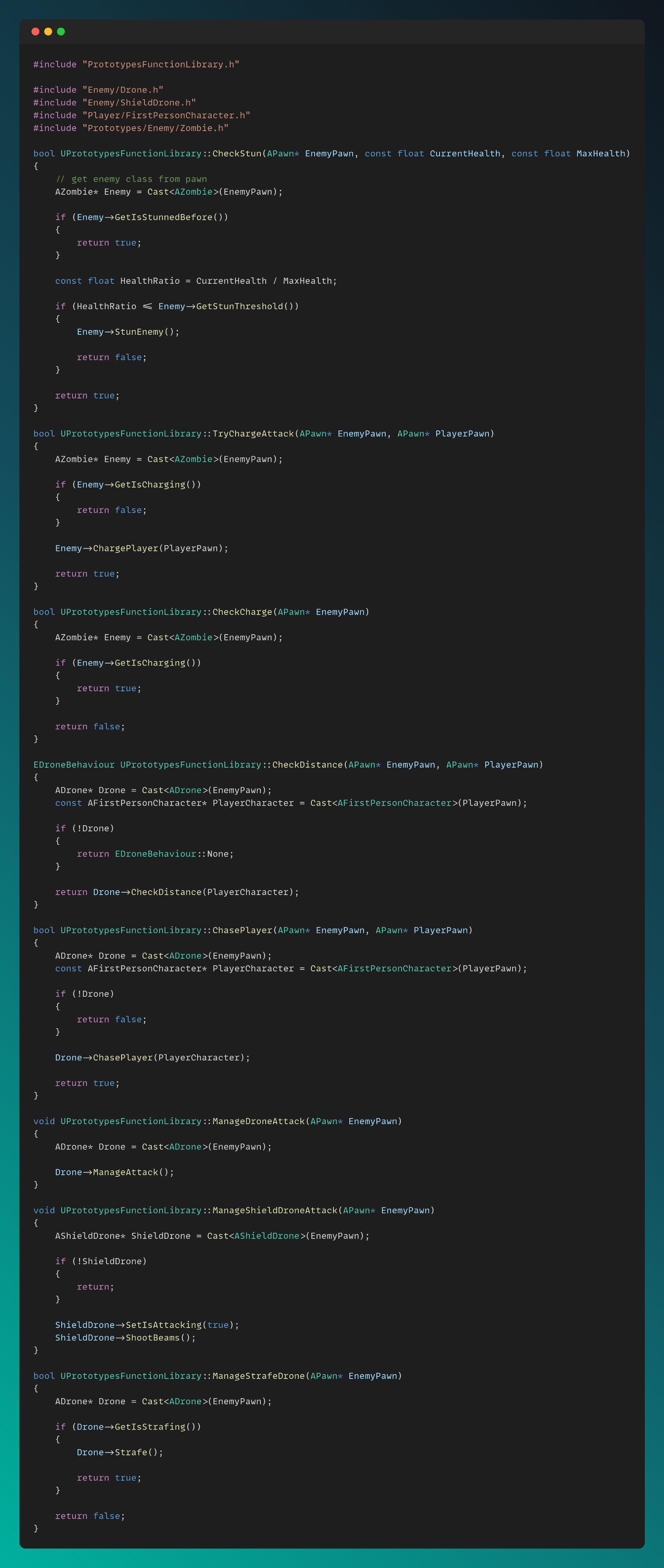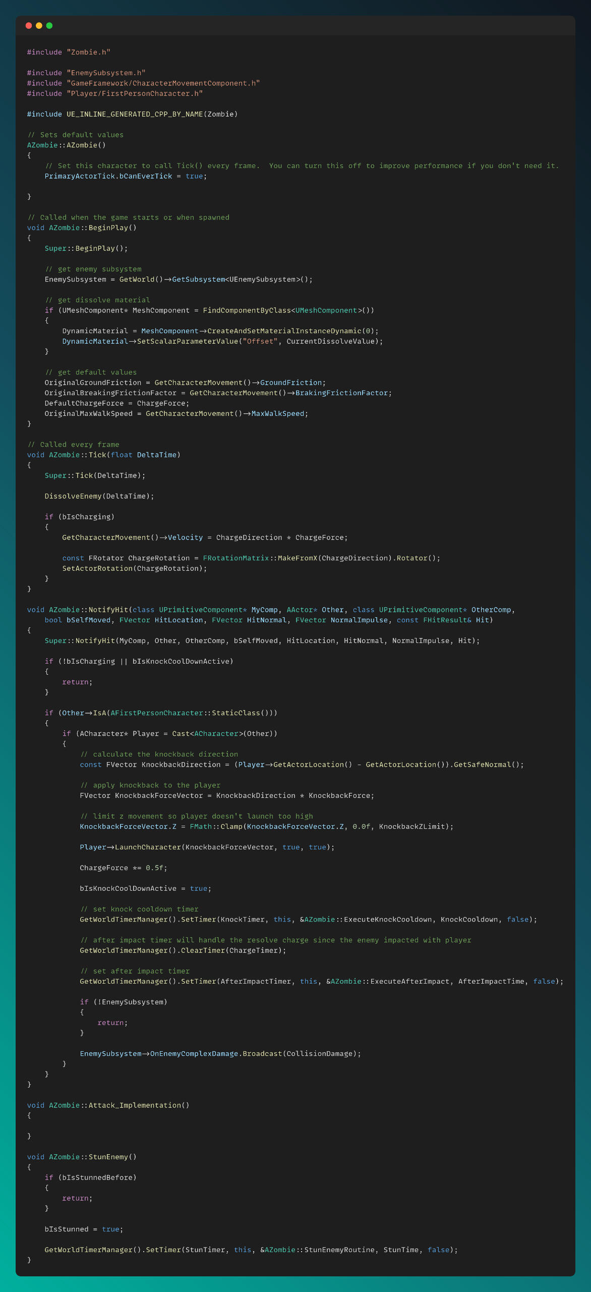 I created a BaseEnemy class as the parent of all enemy types, and derived Zombie and Drone enemies from it. Additionally, Shield Drones, which have special abilities such as shooting beams and generating shields, are derived from the Drone class.The Zombie.cpp file can be seen below. The functionality for tanky zombies, which charge toward the player and can be stunned, is also implemented in the main Zombie.cpp script.