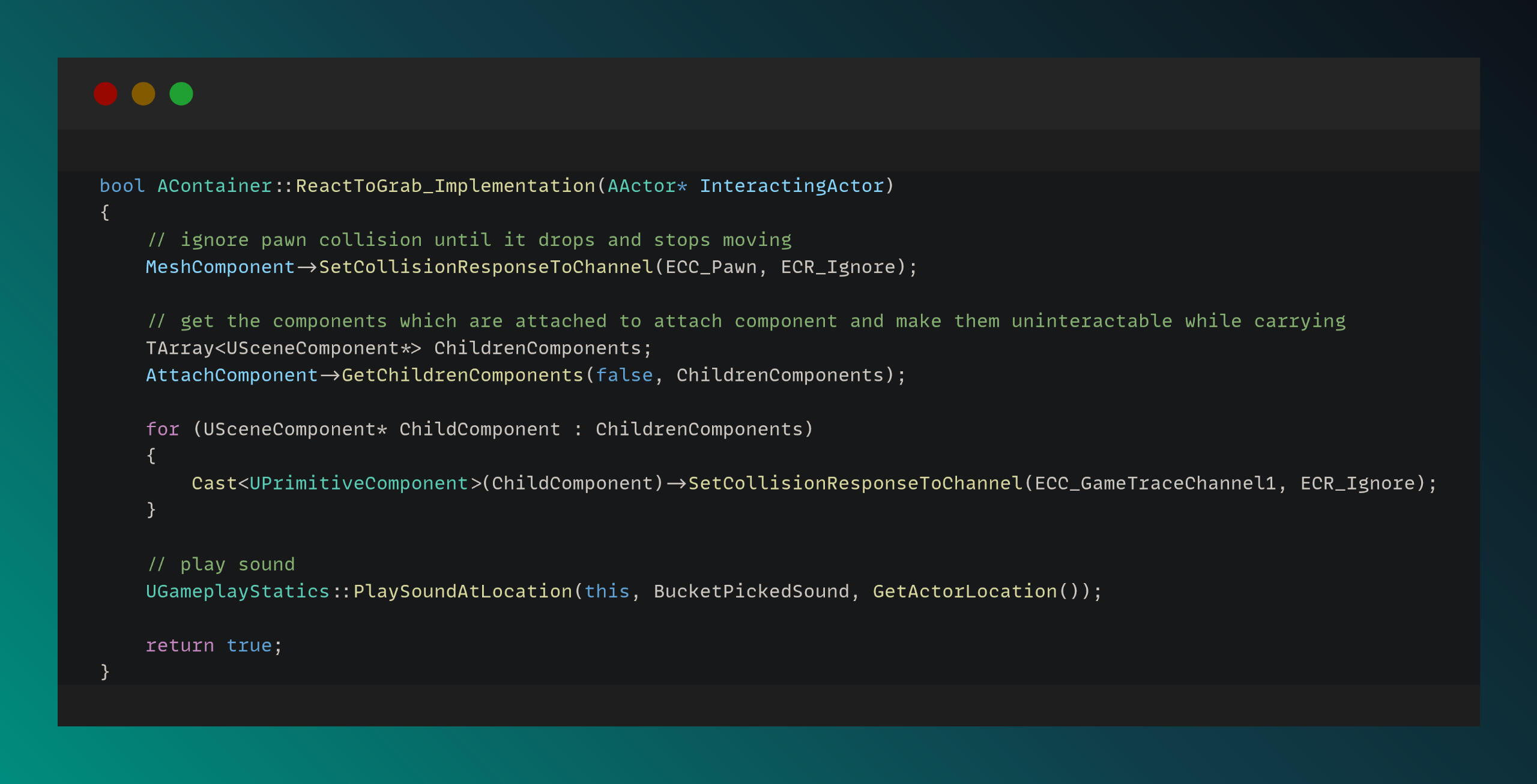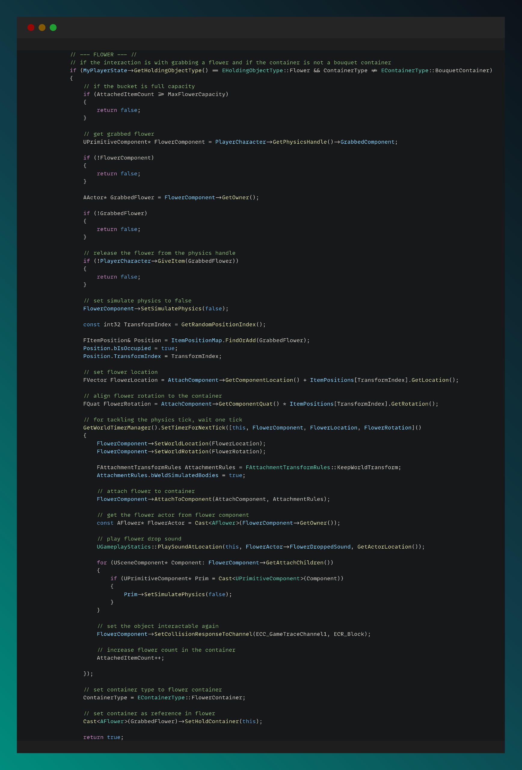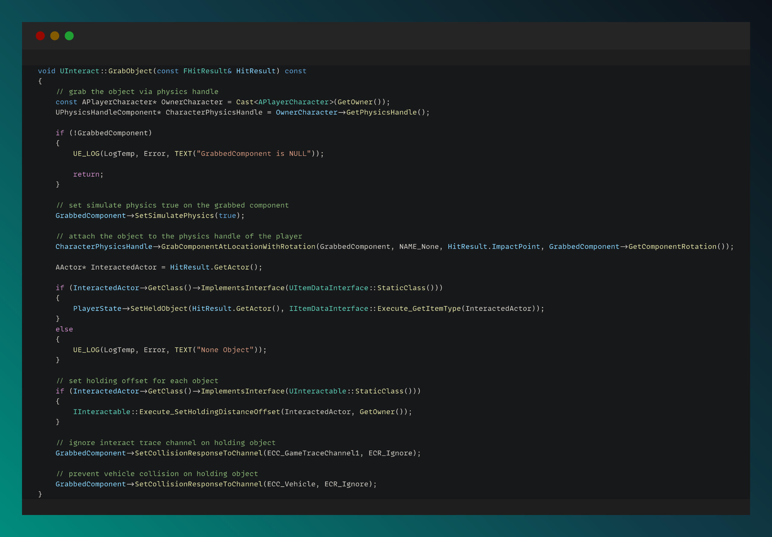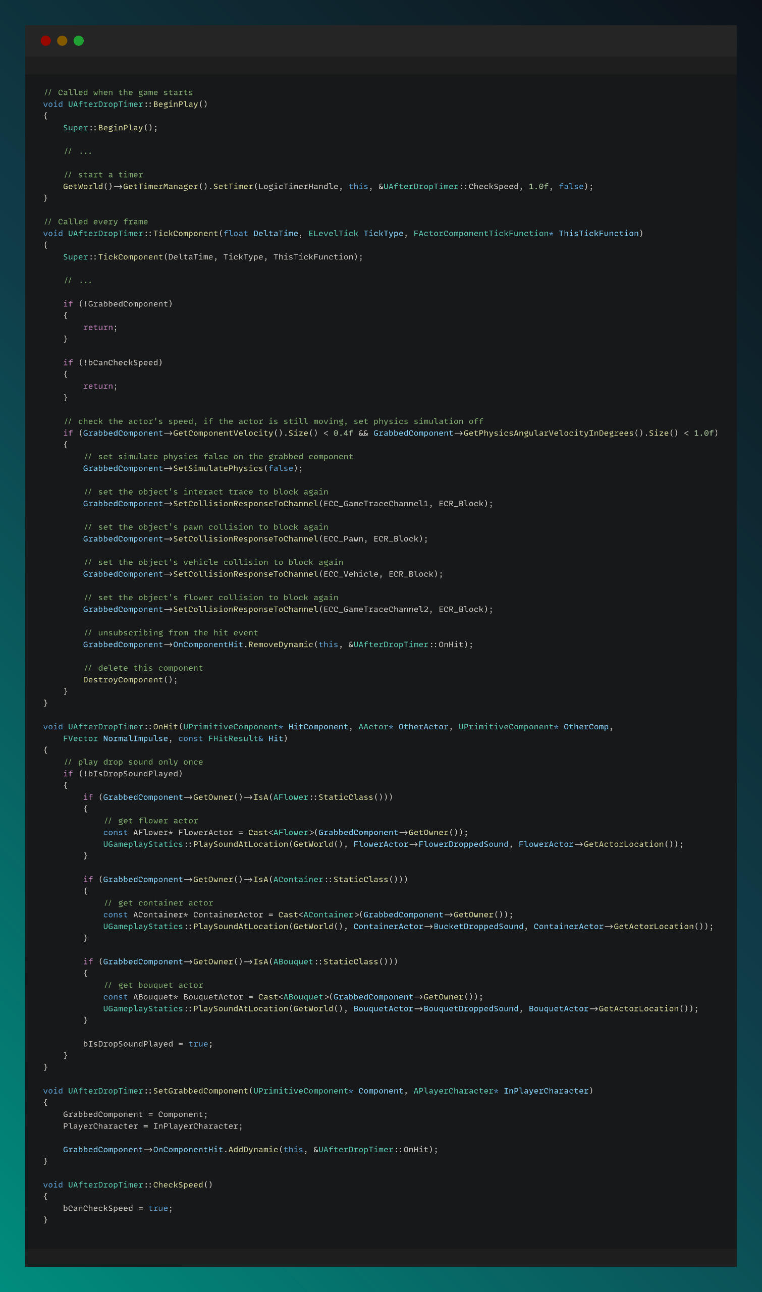In the functions below, I manage the grabbing and dropping functionality by accessing and manipulating the physics system.