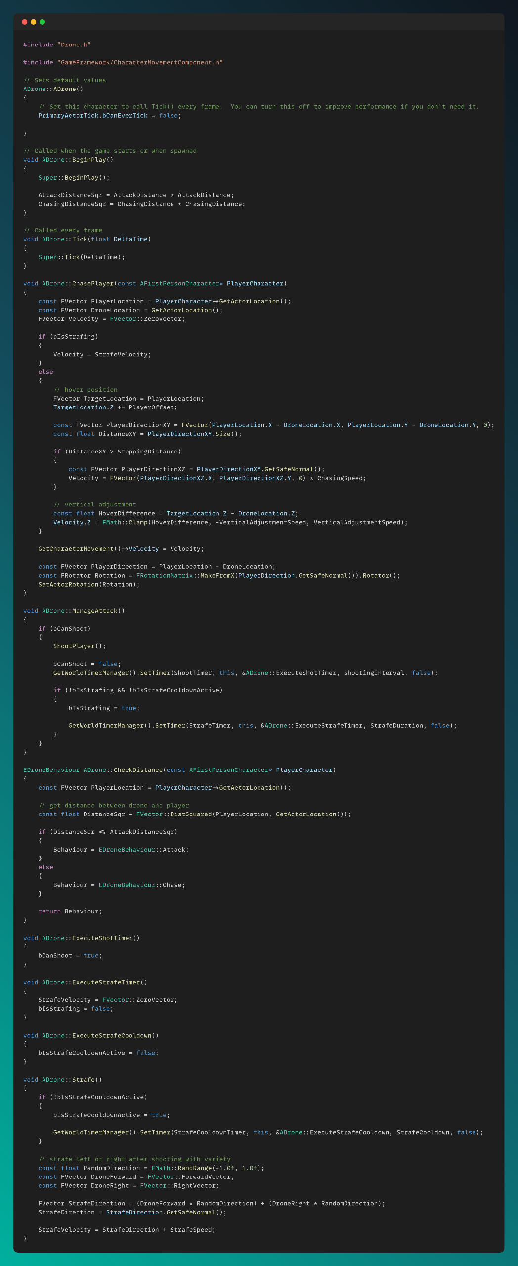 The drones, which hover over the player and perform a radial strafe after attacking, have their script shown below: