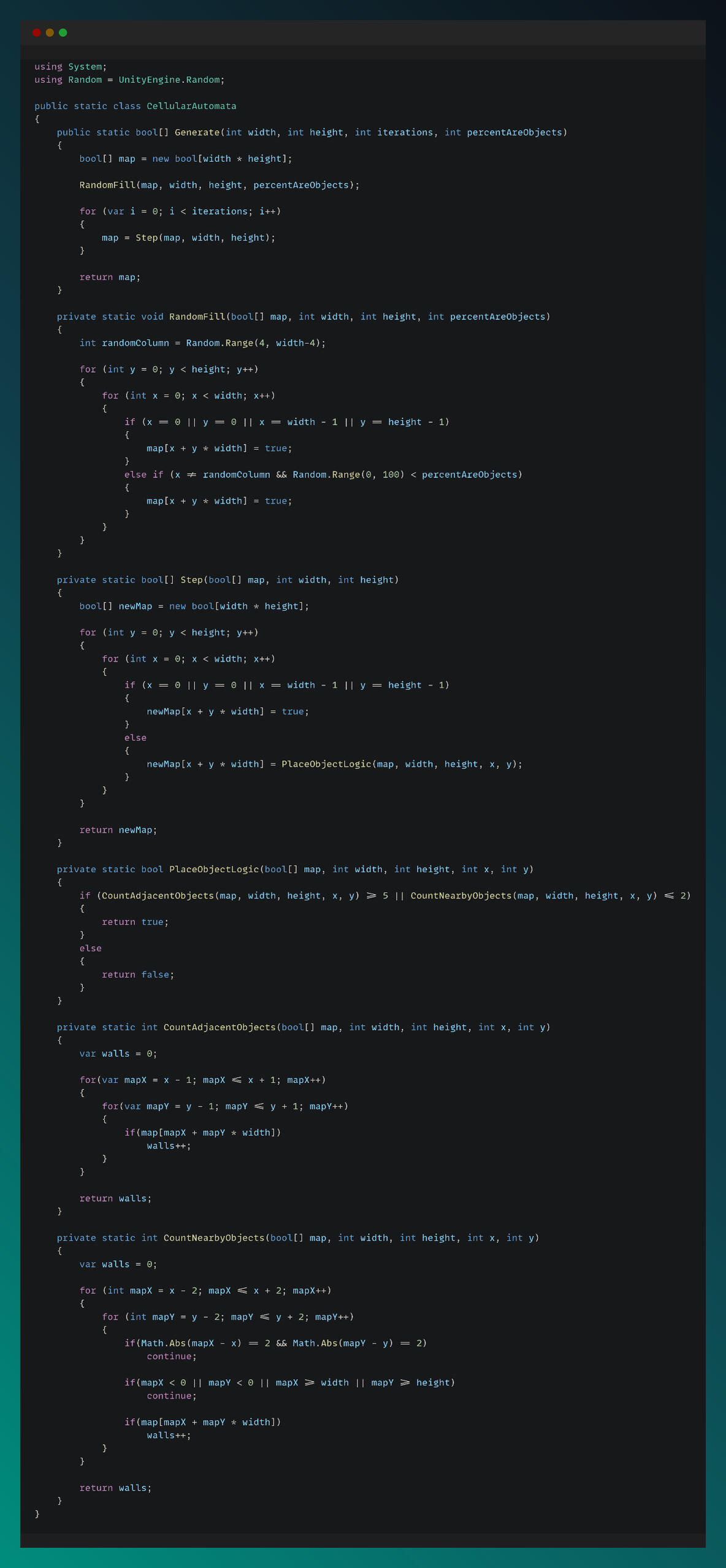 The codes are shown some parts of the procedural map generation logic with using Cellular Automata algorithm and Influence Map mapping.