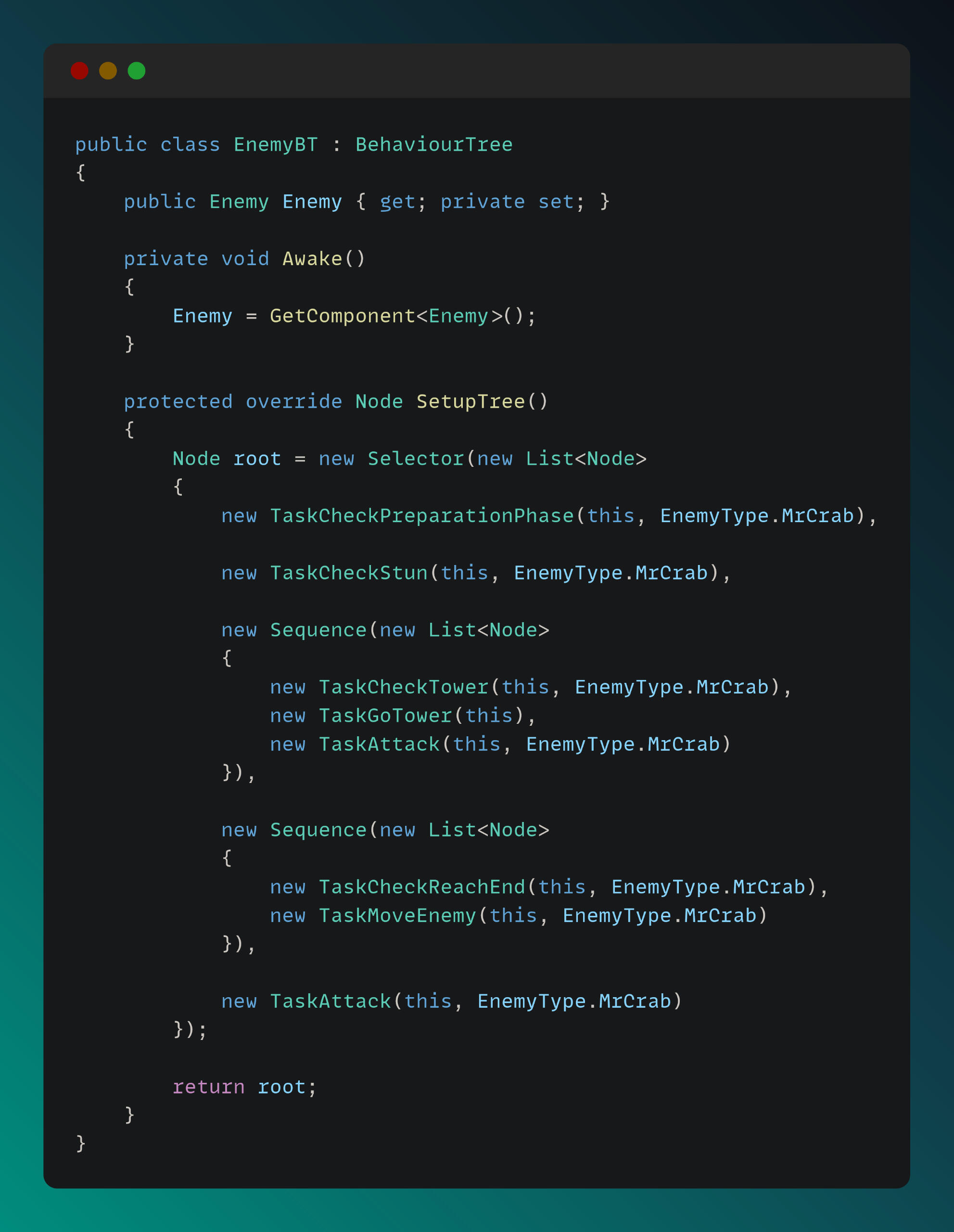 Enemy AI logic is driven by a Behavior Tree system. I designed and implemented the Behavior Tree and its tasks to meet the gameplay requirements. The EnemyBT script is shown below.